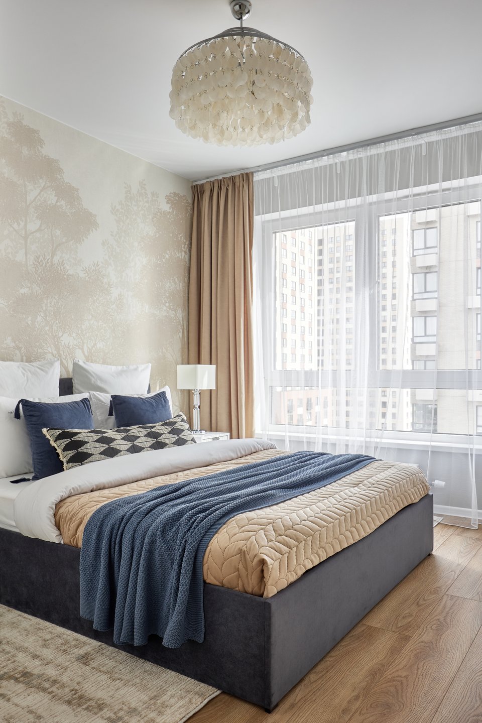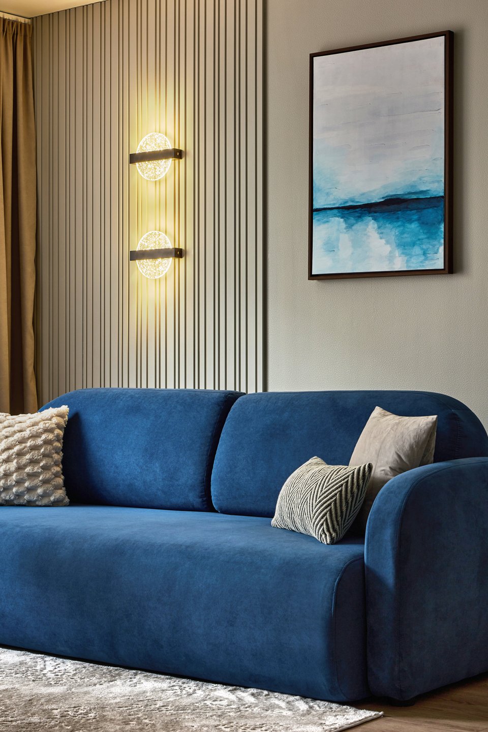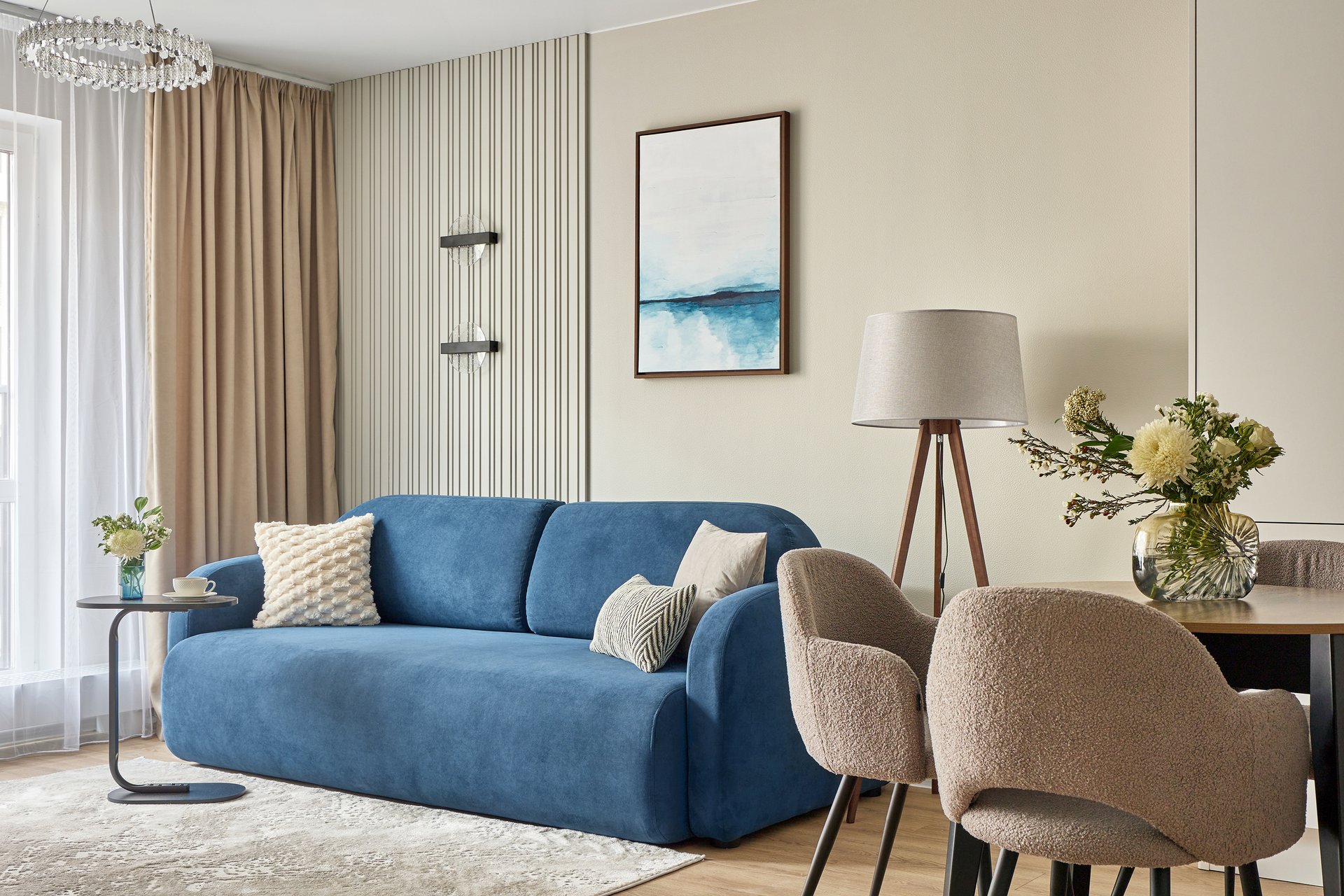 В качестве базы для этого интерьера выбрали светлый серо-бежевый оттенок стен. Спокойную палитру разбавили синими акцентами и деревом цвета орех. Посмотрим, что получилось.