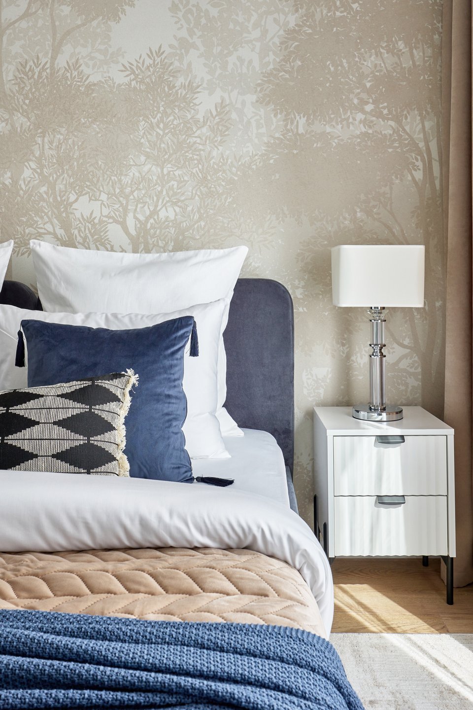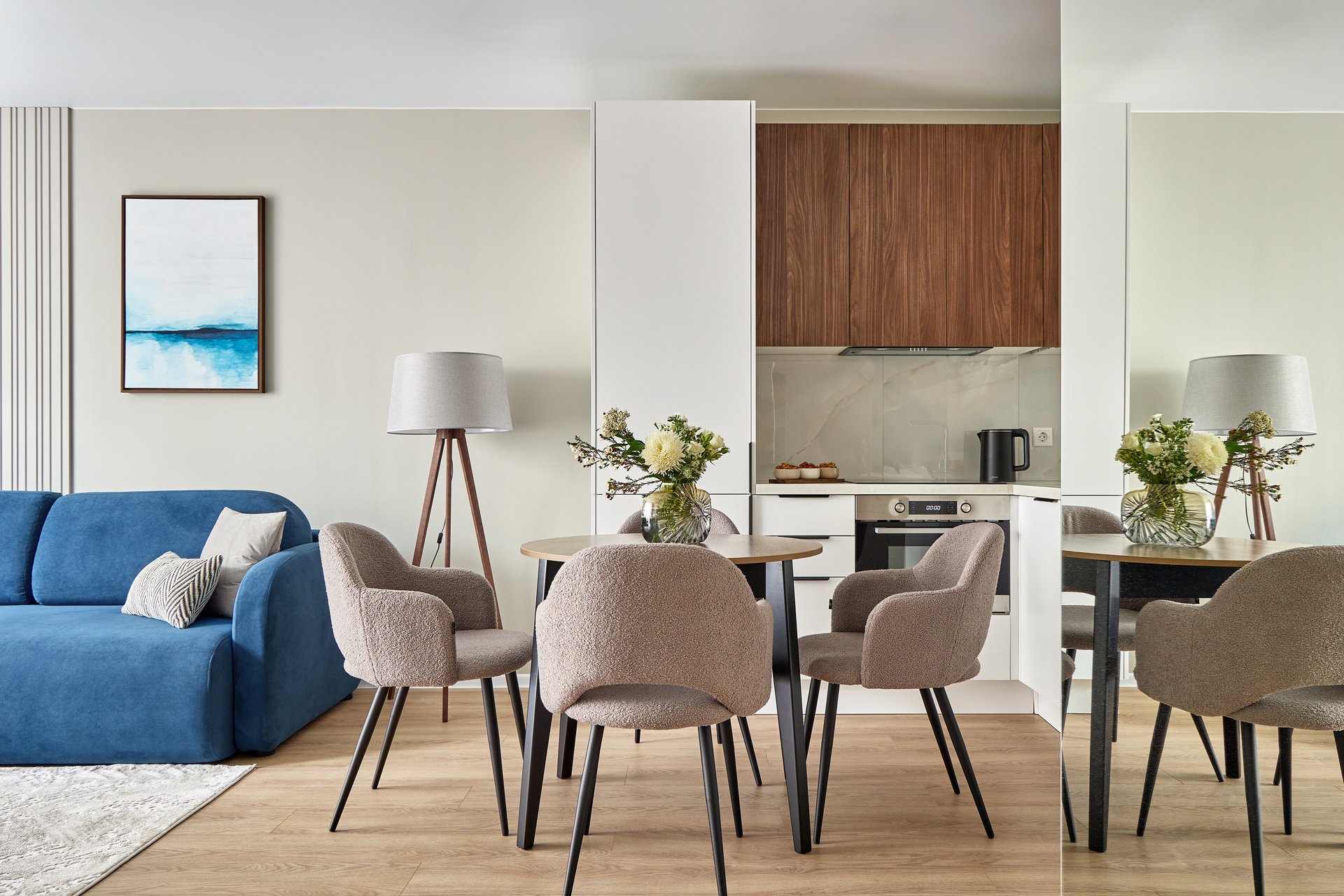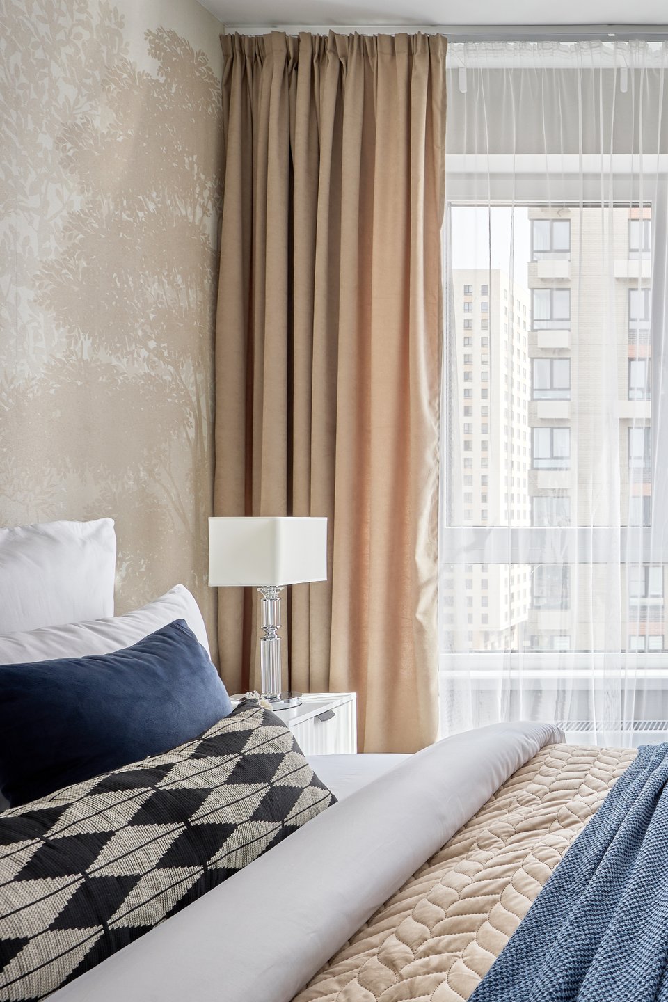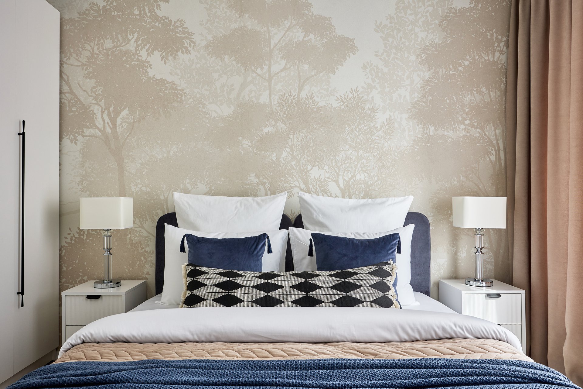 В качестве базы для этого интерьера выбрали светлый серо-бежевый оттенок стен. Спокойную палитру разбавили синими акцентами и деревом цвета орех. Посмотрим, что получилось.