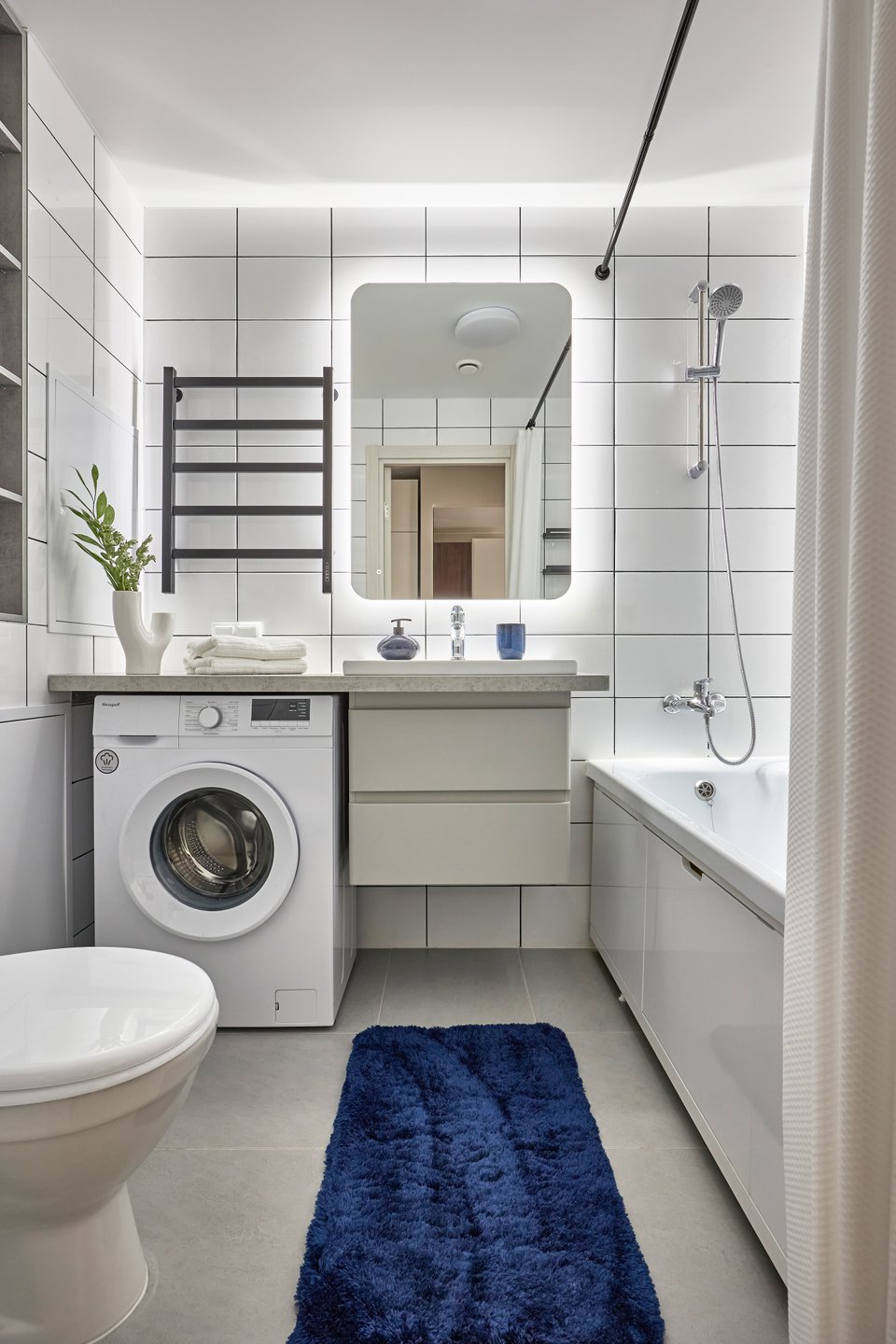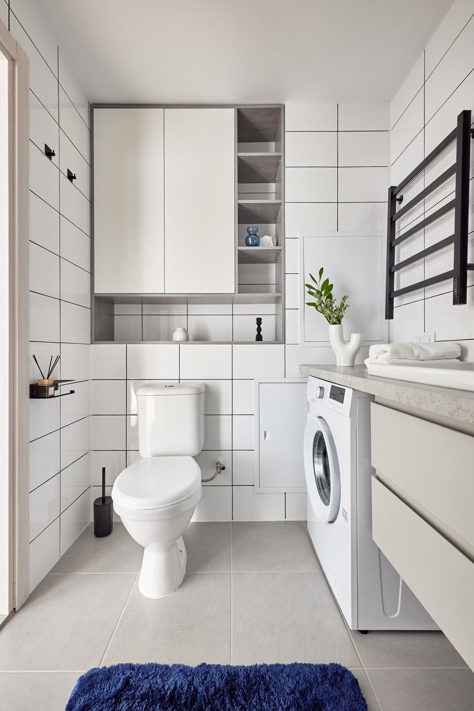 Отделку в санузле оставили от застройщика, только затирку покрасили в черный цвет. Заменили экран под ванной, установили подвесную тумбу, столешницу, в нее врезали раковину. Шкаф в нишу изготовили на заказ.