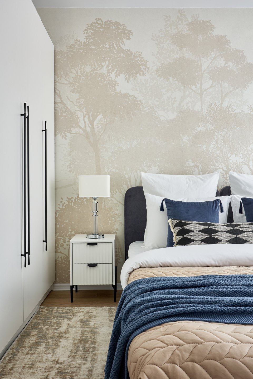 Стены в спальне покрыли той же краской, что и во всей квартире. За изголовьем наклеили фотообои. Спальня небольшая, поэтому здесь разместили только базовый набор мебели: кровать со спальным местом шириной 160 см, шкаф и две прикроватные тумбы. Секция шкафа возле тумбы не открывается. Она предназначена для сезонного хранения (при необходимости можно отодвинуть тумбу).