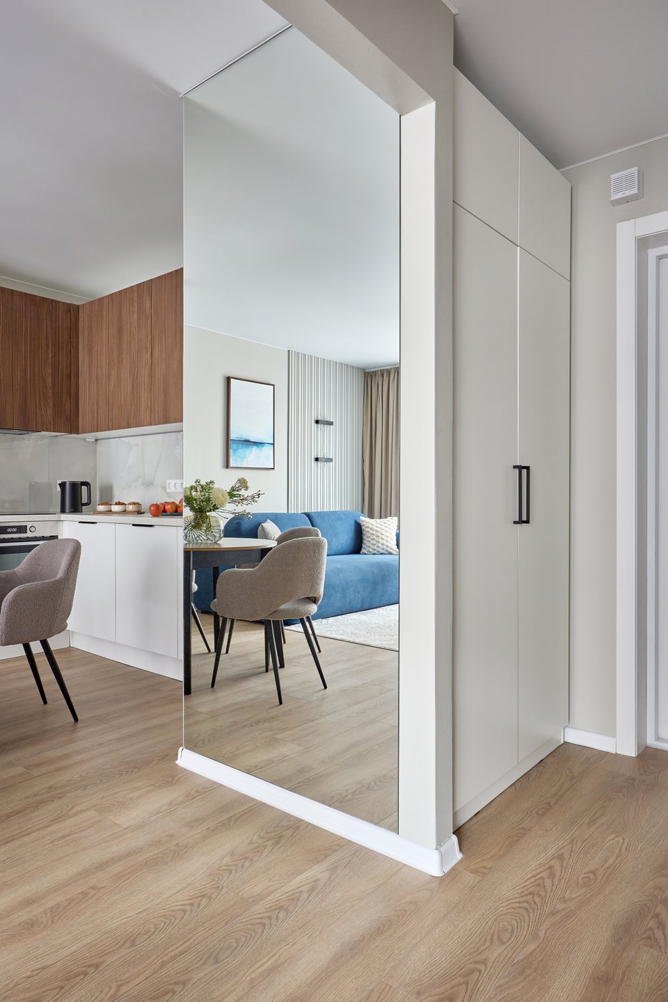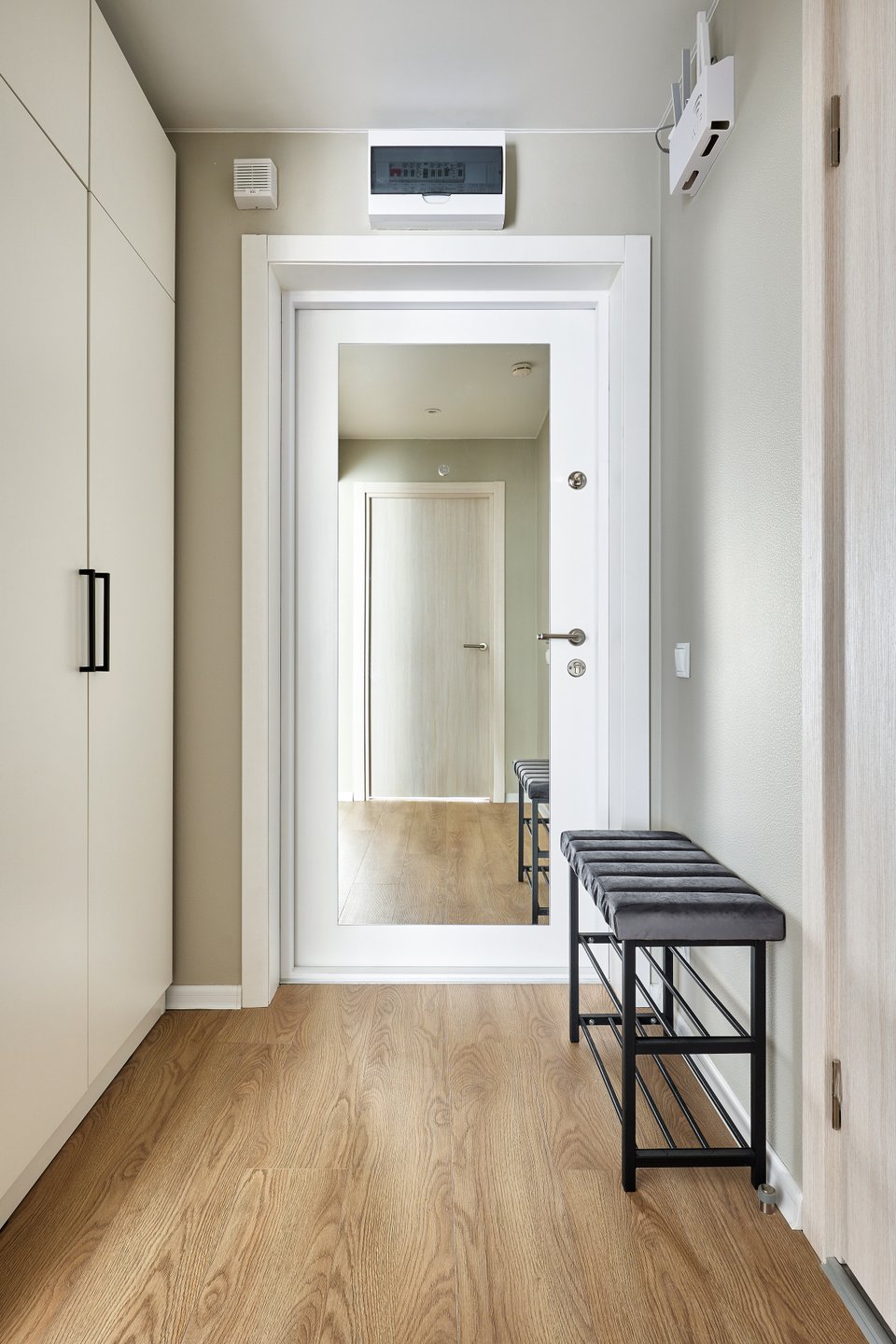 На дверь в прихожей наклеили зеркало в полный рост. Для верхней одежды установили готовый шкаф с полками и штангой. Банкетка при входе оснащена полками для обуви.