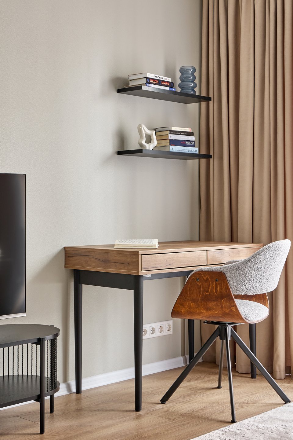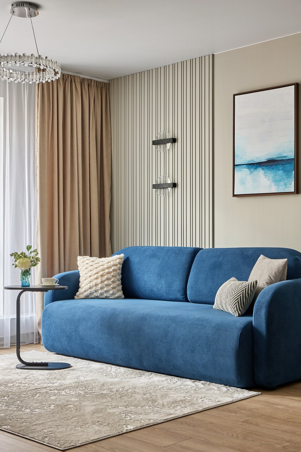 Мебель для зоны отдыха заказали в divan.ru. Синий диван Клаймар привлек модной обтекаемой формой и удобной посадкой. Письменный стол Эльси сочетается с кухонными фасадами. ТВ-тумба Харис визуально легкая — то, что нужно для небольшого помещения, чтобы не загромождать пространство.
