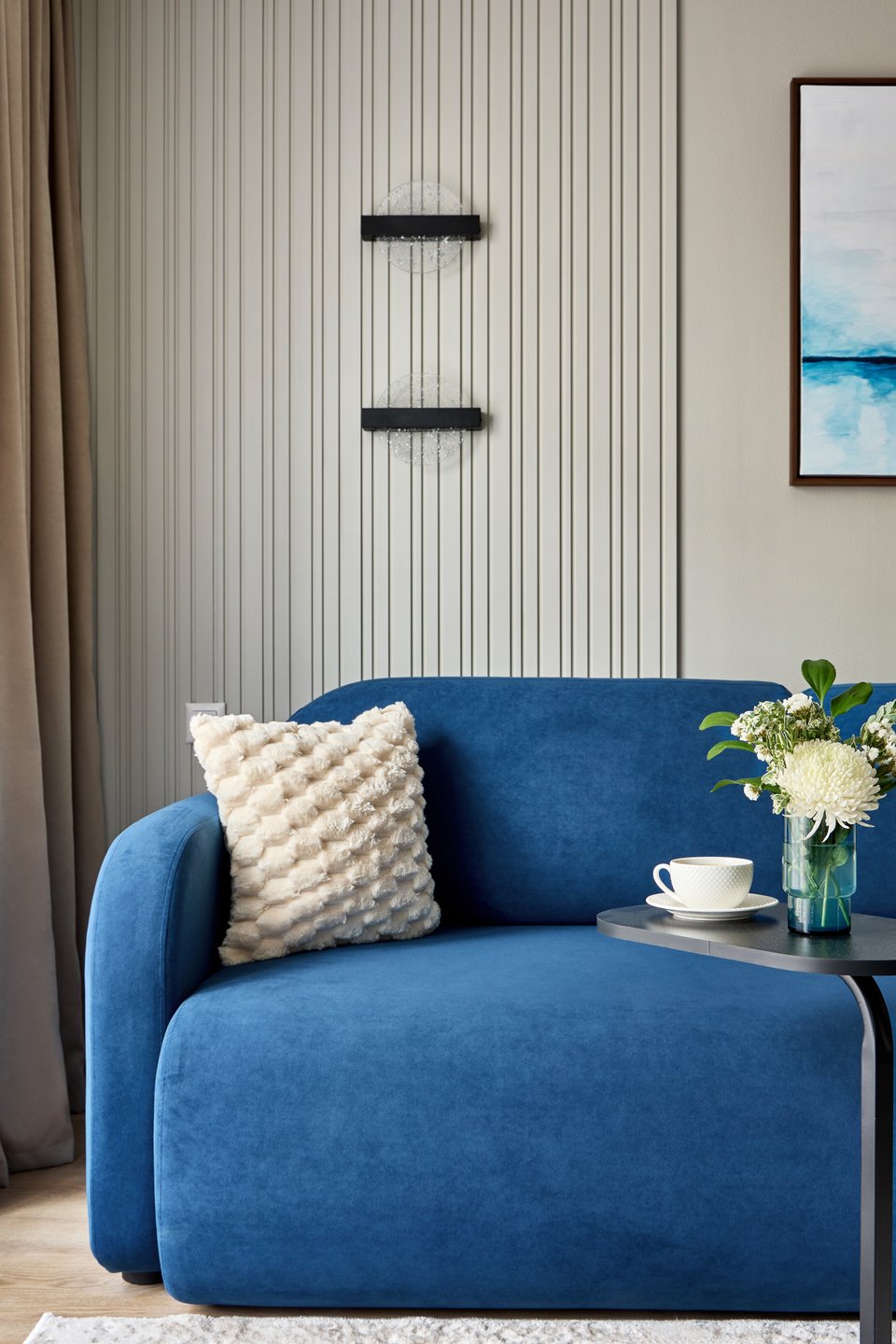 «Стены за диваном задекорировали панелями и повесили акцентные бра, — комментируют авторы проекта. — Это идеальный вариант атмосферного освещения, если позволяет бюджет. Для дополнительного уюта есть торшер с мягким светом».