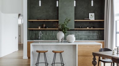 - На фото 1: интерьер кухни-гостиной в загородном доме. Дизайнер: Маша Кунякина (@kunyakina); фотограф: Ольга Мелекесцева. Проект реализован в рамках передачи «Дачный ответ»