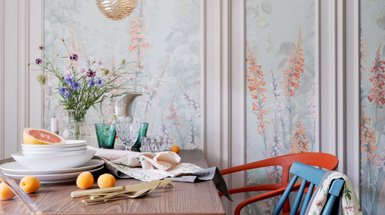 На фото: интерьер столовой комнаты в русском стиле — концепция реализована в рамках проекта Trend Rooms на площадке международной выставки интерьерных тканей, домашнего текстиля и материалов для декорирования Hometextile & Design 2024. Авторы: дизайнер Элина Туктамишева, текстильный декоратор Мария Шайдаюк. Подробная информация о комнате и авторах есть на странице проекта