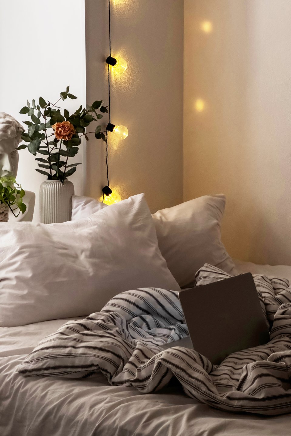Гирлянды на изголовье кровати. Используйте модели с теплым желтоватым, а не холодным белым свечением. Они создадут мягкое, романтичное освещение и подарят ощущение волшебства.