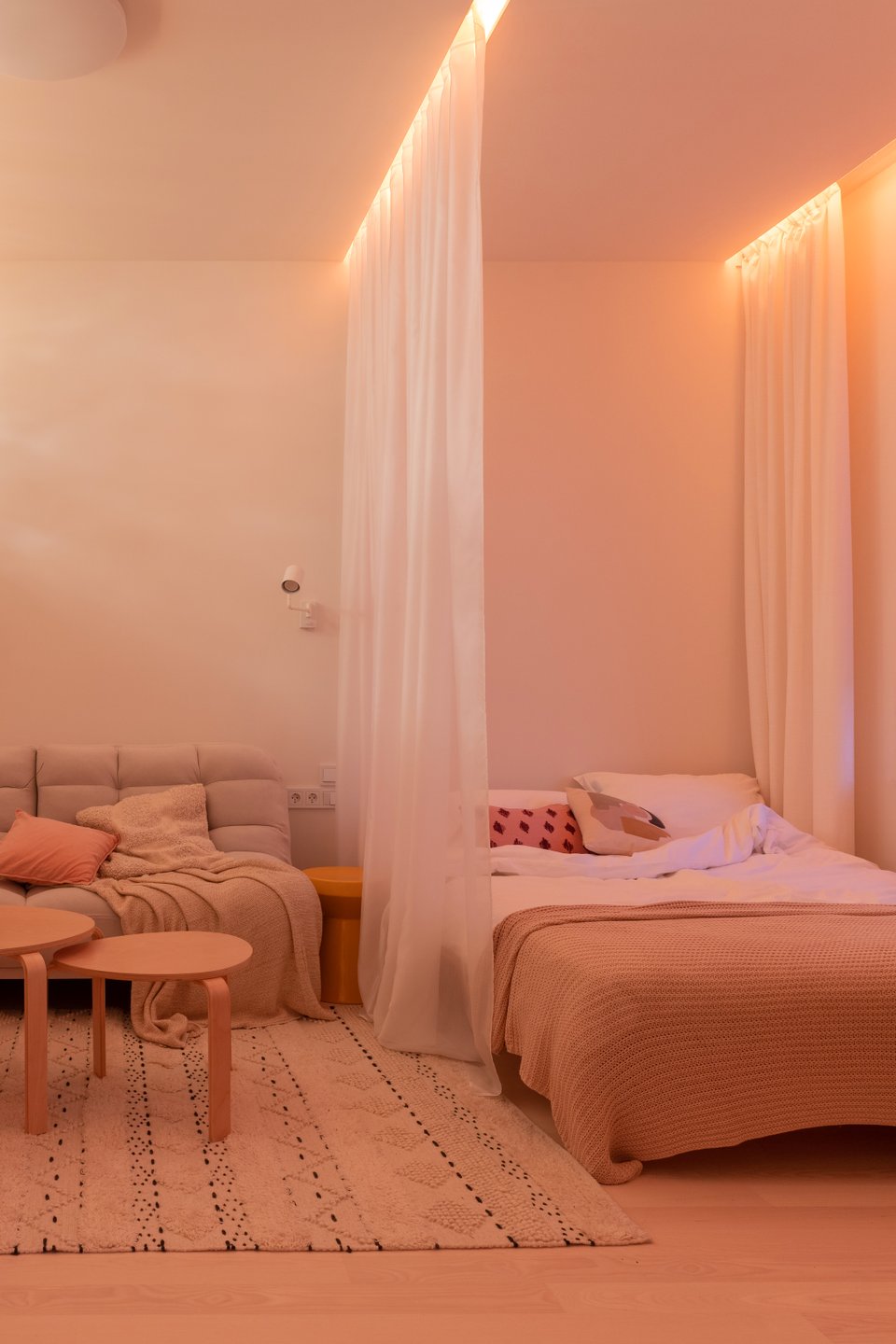 - Никакого визуального шума. Яркий цвет удастся спрятать в любой момент, не прилагая больших усилий — достаточно закрыть дверцу, задвинуть ящик или пересесть в другое кресло.