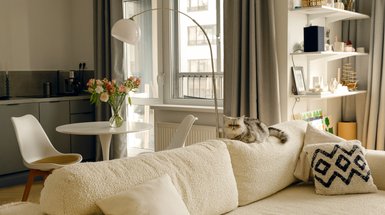 На заметку: для дивана выбрали велюровую обивку из коллекции Gesta — бархатистая ткань с переливами ворса эффектно меняет оттенки в зависимости от угла падения света. Кроме того, велюр износоустойчив и дружелюбен к домашним питомцам.