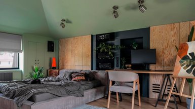 Припыленный травянисто-зеленый цвет стен, характерный для ретроинтерьеров, создает в гостиной камерную обстановку. Фактурные обои, рифленые поверхности, древесные текстуры делают пространство объемнее и уютнее. Чтобы не перегружать комнату цветом, для зоны отдыха выбрали диван Динс в нейтральной светло-серой обивке.