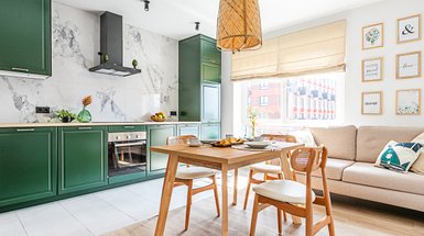 Кухня выполнена на заказ. Фасады и фартук из стекла в цвет стен смотрятся лаконично и не привлекают лишнего внимания. Холодильник и духовой шкаф с функцией СВЧ встроены в колонну. Удалось разместить и посудомоечную машину шириной 45 см. Под раковиной установлен фильтр и измельчитель. В верхних шкафах пенала хранятся новогодние игрушки и декор для праздников.