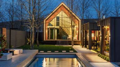 Большие окна в доме со вторым светом хорошо пропускают солнечные лучи и делают помещение просторнее и приятнее. Нюанс в том, что в ночное время такая постройка требует большего освещения, чем обычная. Профессионалы советуют организовать многоуровневую подсветку от потолка до пола для разных целей. Например, подвесные люстры — для общего освещения, бра и подсветка — для рассеянного или точечного, торшеры и лампы — для функционального.