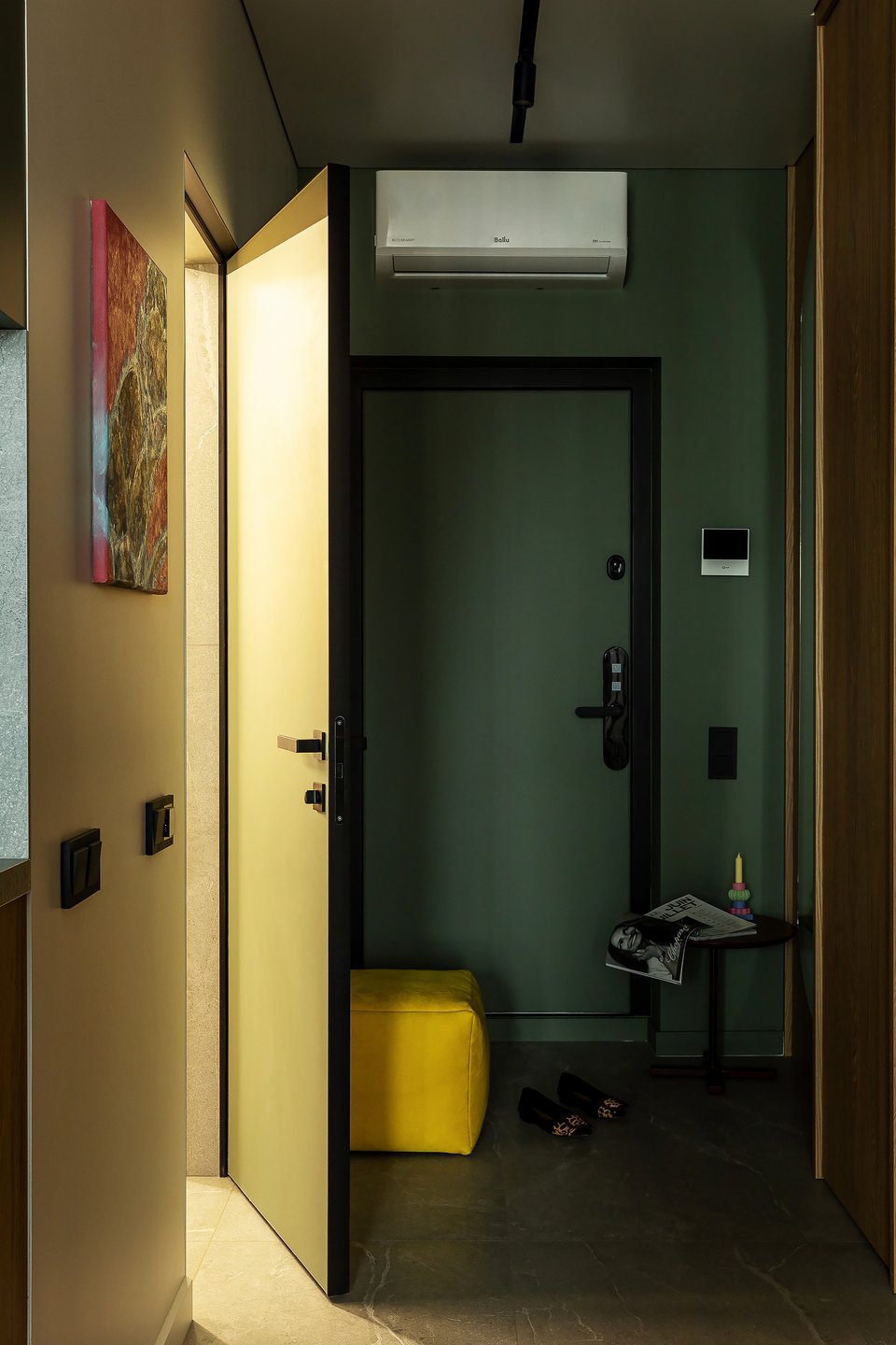 Стены, входную и скрытую двери покрыли стойкой антивандальной краской. Одну стену оставили светлой, чтобы визуально не сужать и без того узкий коридор и увязать отделку с белым цветом в зоне окон. Прихожая начинается с небольшой ниши, которая образовалась из-за вентиляционной шахты. В ней организовали зону с зеркалом в пол, пуфом и столиком. Зеркало зрительно расширяет пространство. Далее идет шкаф для одежды и хозблок, где хранятся бытовые принадлежности и инвентарь для уборки.