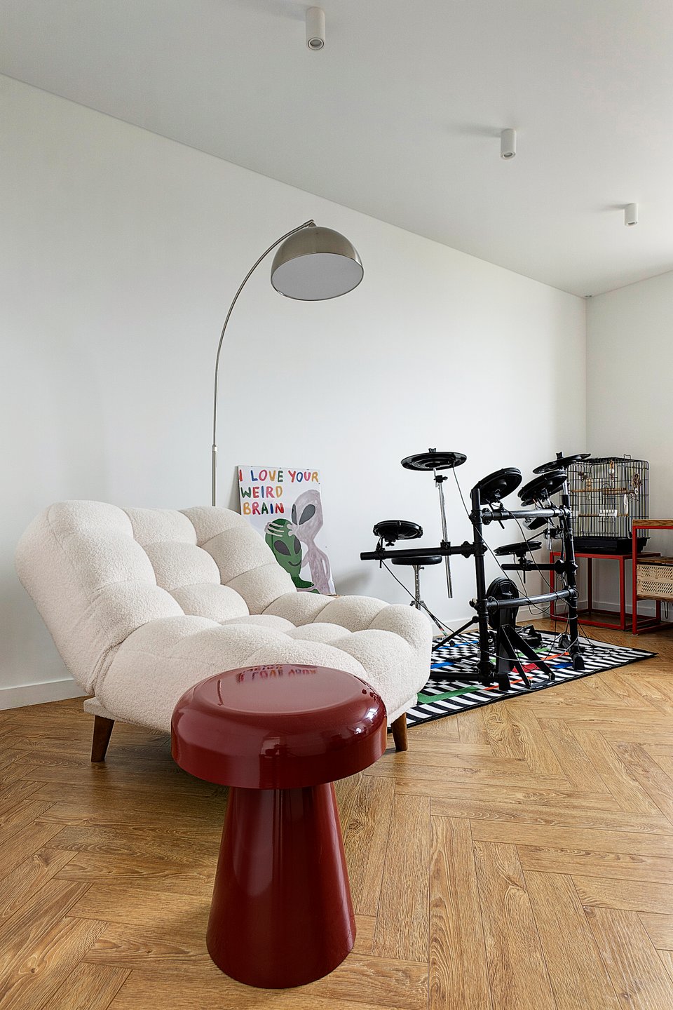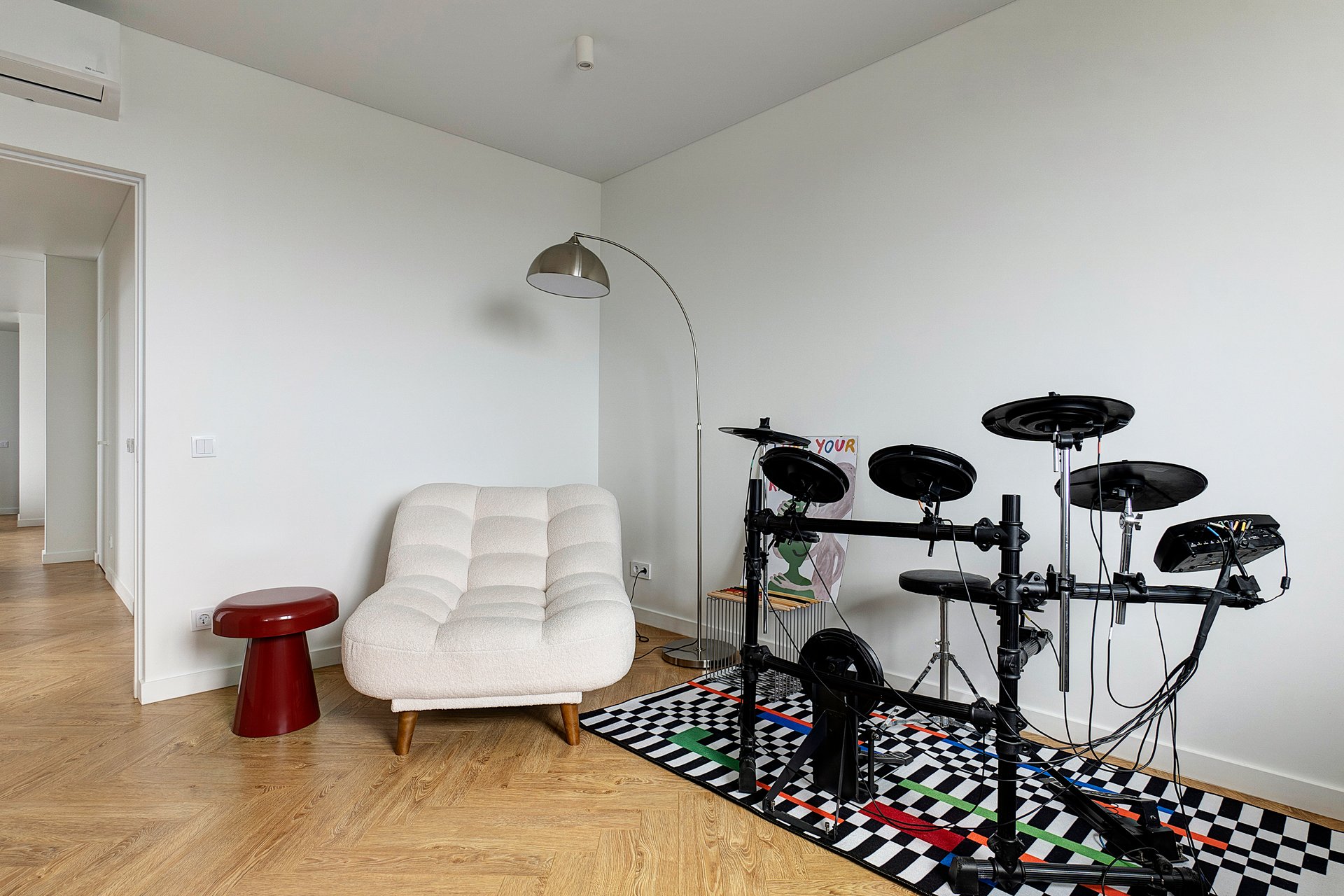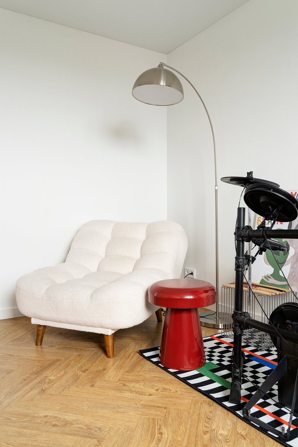 В кабинете мы выделили несколько зон: рабочую, зону отдыха и зону игры на барабанах. Отдельного внимания заслуживает большое мягкое и удобное кресло Бонс-Т от divan.ru (ткань обивки и цвет опор мы выбрали в «Конструкторе мебели» на сайте) и рабочие стулья от SAMPLE CUSTOM. Кресло — любимый предмет мебели Александра, он проводит здесь большую часть времени. Торшер Грено и журнальный стол Имба добавляют комфорта.