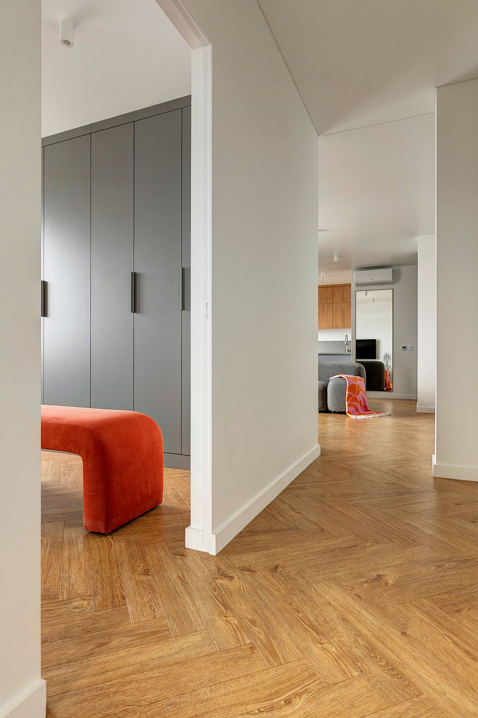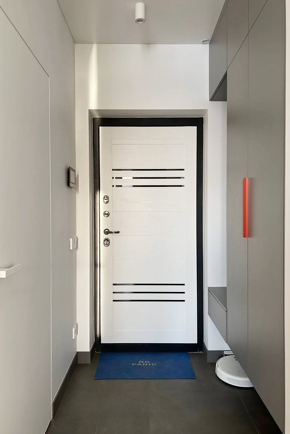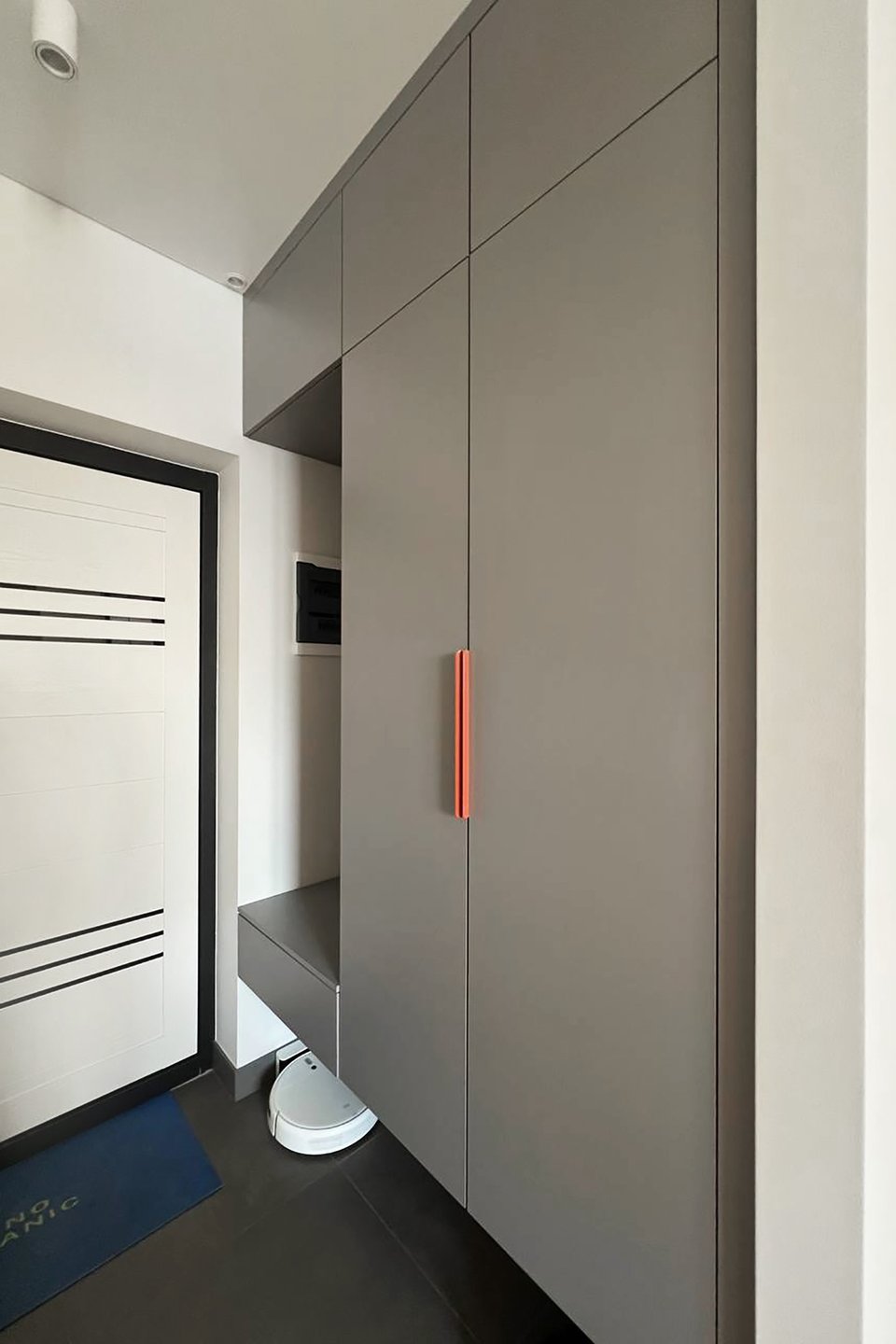 В нише расположили шкаф. Внизу оставили пространство для обуви и разместили несколько розеток, чтобы заряжать робот-пылесос и сушить обувь. Мыть пол в этой зоне гораздо проще, чем шкаф внутри, а если задвинуть обувь к стене, ее совсем не видно, и шкаф будто парит в воздухе. Разбавить серый оттенок шкафа решили ручками терракотового цвета.
