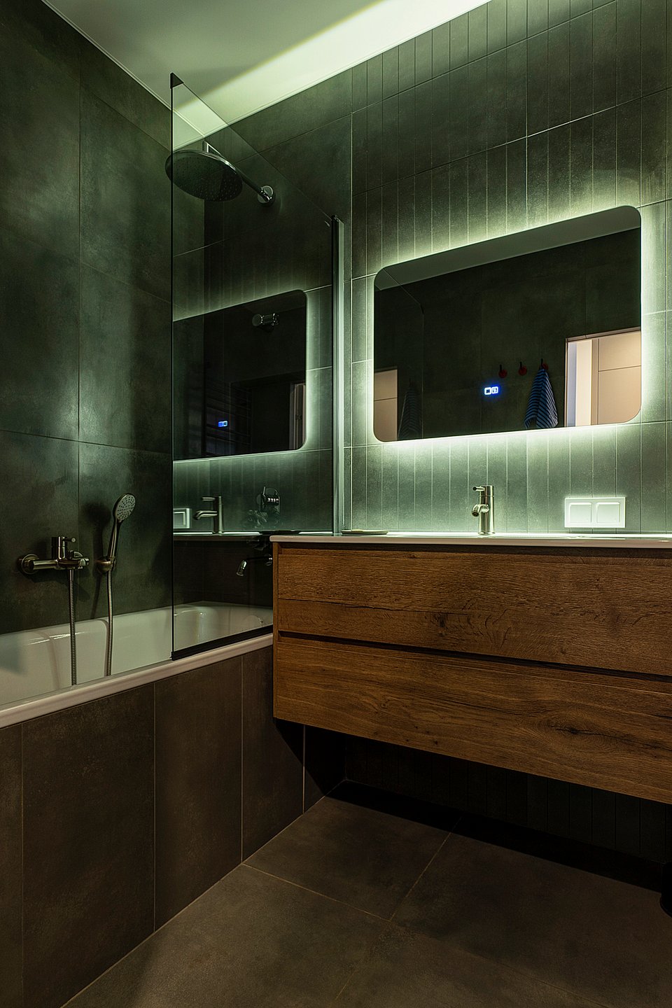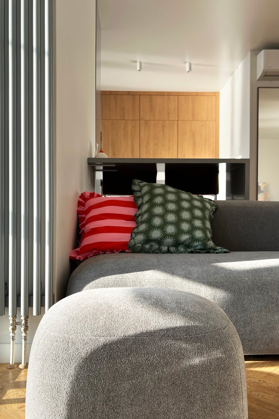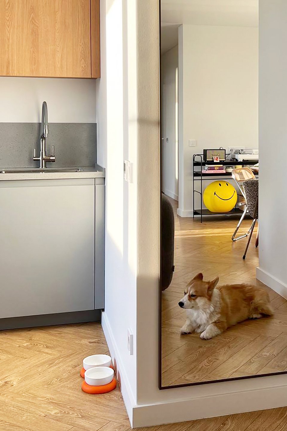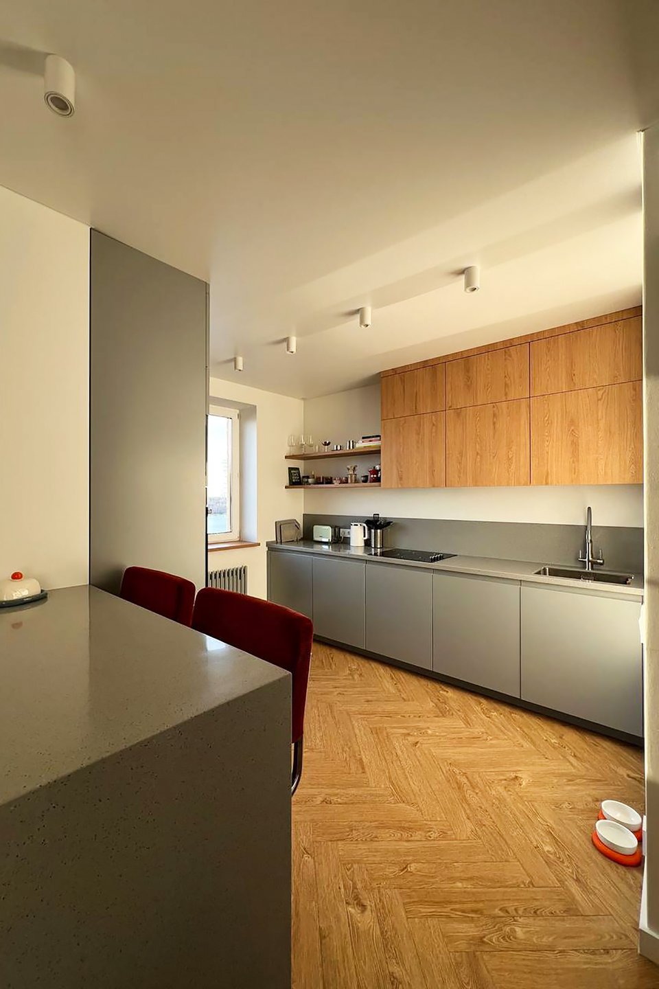 В нише расположили шкаф. Внизу оставили пространство для обуви и разместили несколько розеток, чтобы заряжать робот-пылесос и сушить обувь. Мыть пол в этой зоне гораздо проще, чем шкаф внутри, а если задвинуть обувь к стене, ее совсем не видно, и шкаф будто парит в воздухе. Разбавить серый оттенок шкафа решили ручками терракотового цвета.