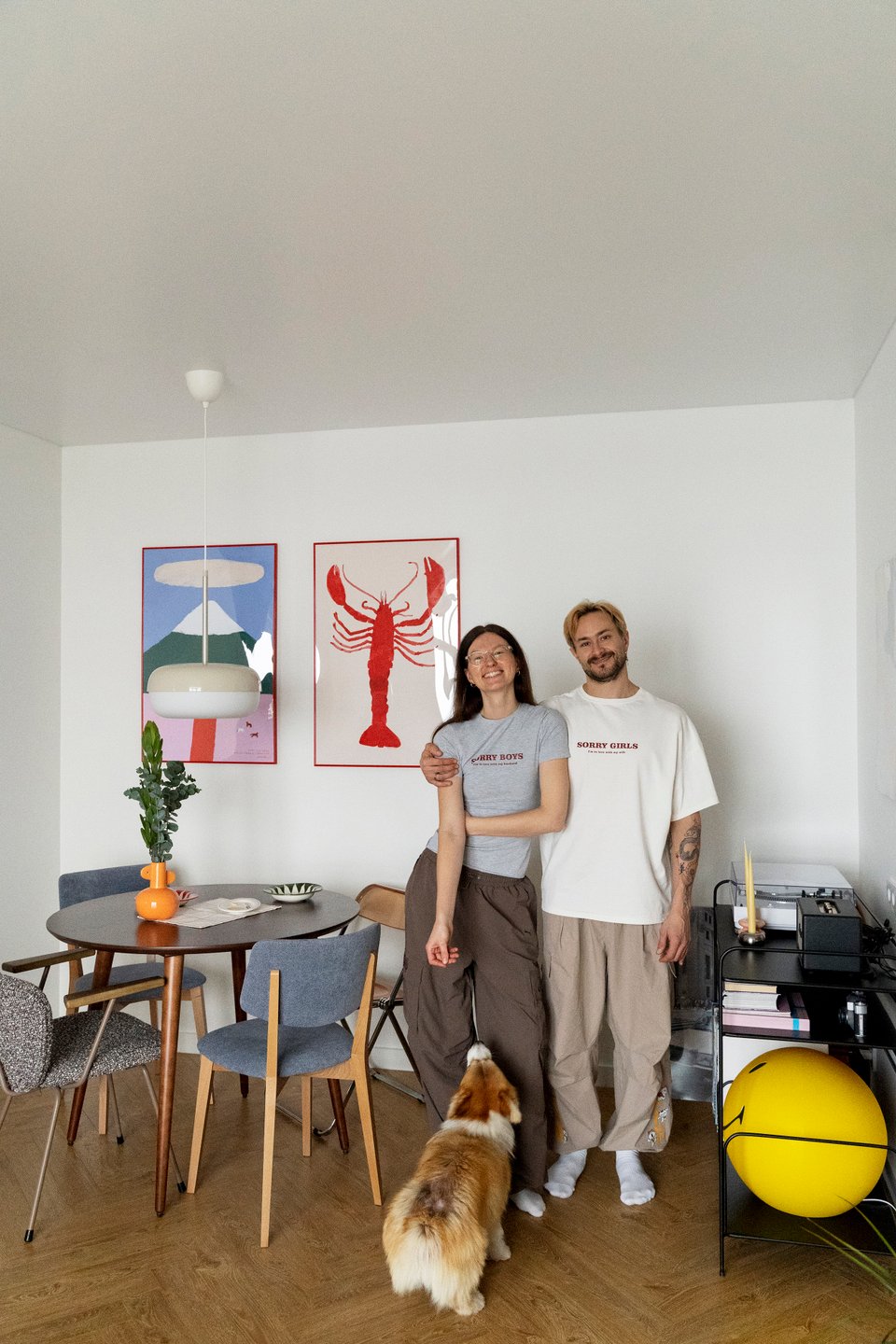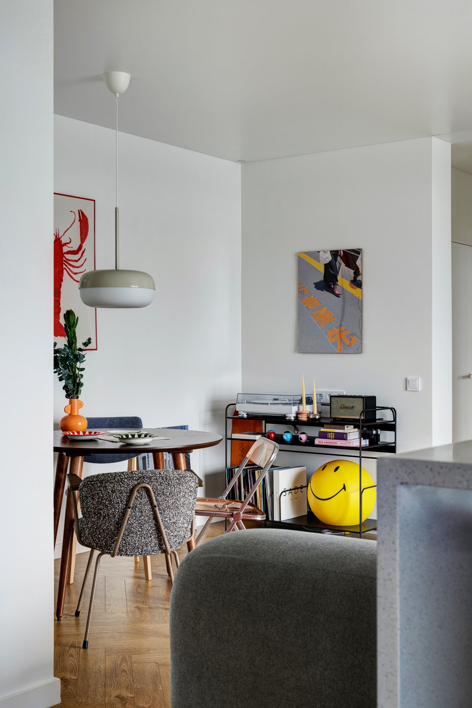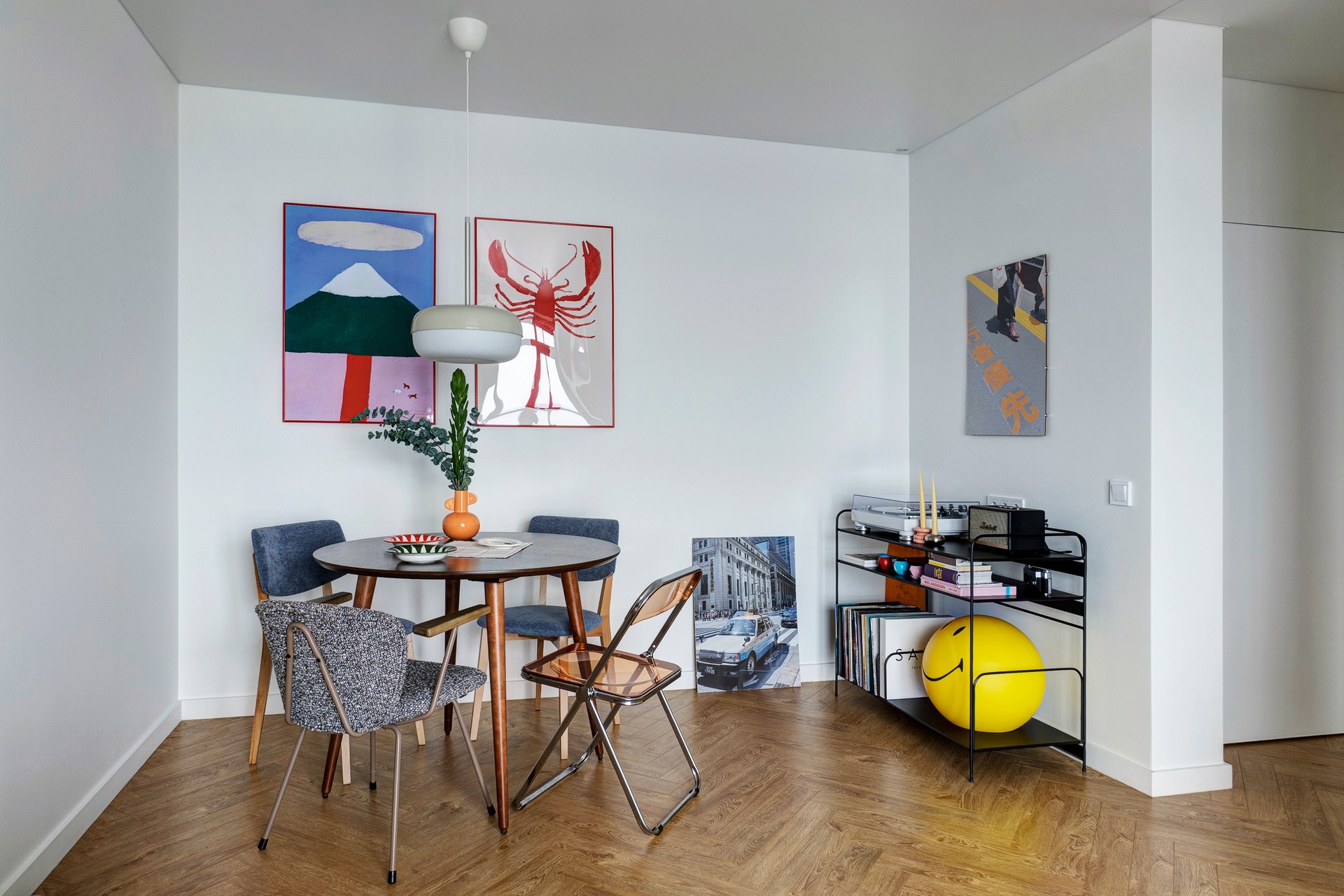 Для дивана и стульев выбрали нейтральные природные оттенки, чтобы не перегружать пространство цветом. Добавили яркие акценты: плед Клипан от divan.ru, постеры над обеденной группой, распечатанные фотографии, которые я сделала в Токио и Осаке, большая лампа-смайл из коллаборации The Smiley и Mr Maria Collection — голландского бренда, который был основан в Амстердаме дизайнерами Яннесом Хаком и Леннартом Боскером, яркие подушки. Один из любимых арт-объектов нашей квартиры также находится в этой комнате. Это «Кот Владислав» от художницы Тони Угловой.