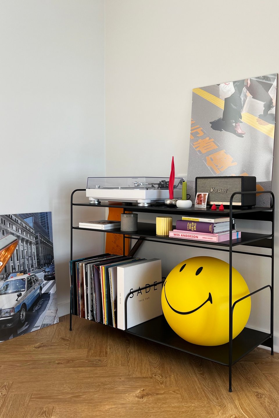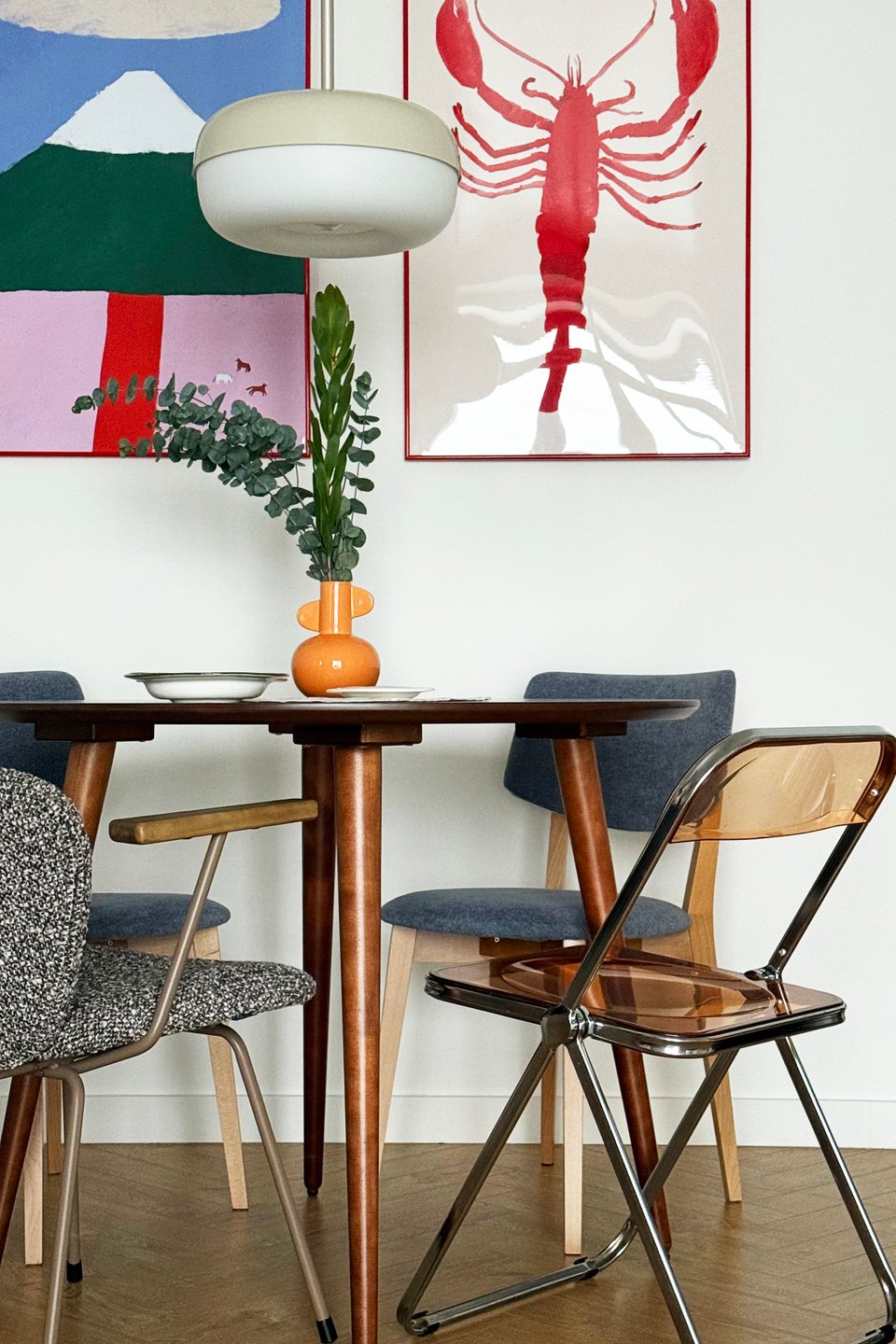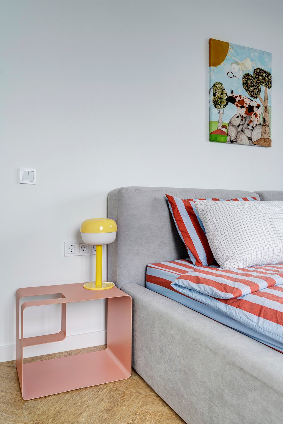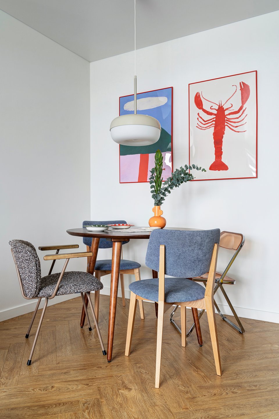 Для дивана и стульев выбрали нейтральные природные оттенки, чтобы не перегружать пространство цветом. Добавили яркие акценты: плед Клипан от divan.ru, постеры над обеденной группой, распечатанные фотографии, которые я сделала в Токио и Осаке, большая лампа-смайл из коллаборации The Smiley и Mr Maria Collection — голландского бренда, который был основан в Амстердаме дизайнерами Яннесом Хаком и Леннартом Боскером, яркие подушки. Один из любимых арт-объектов нашей квартиры также находится в этой комнате. Это «Кот Владислав» от художницы Тони Угловой.