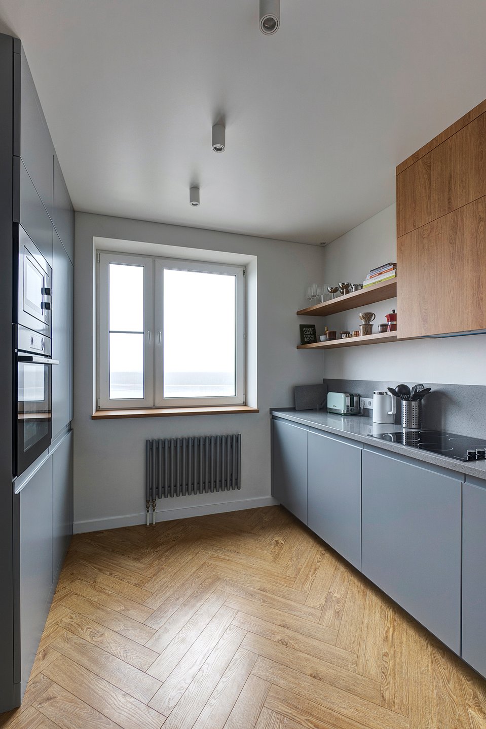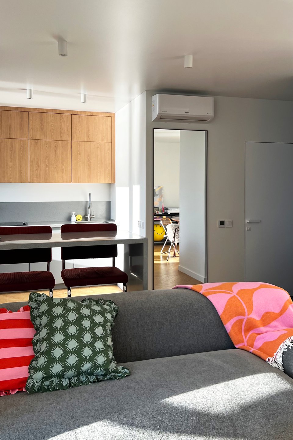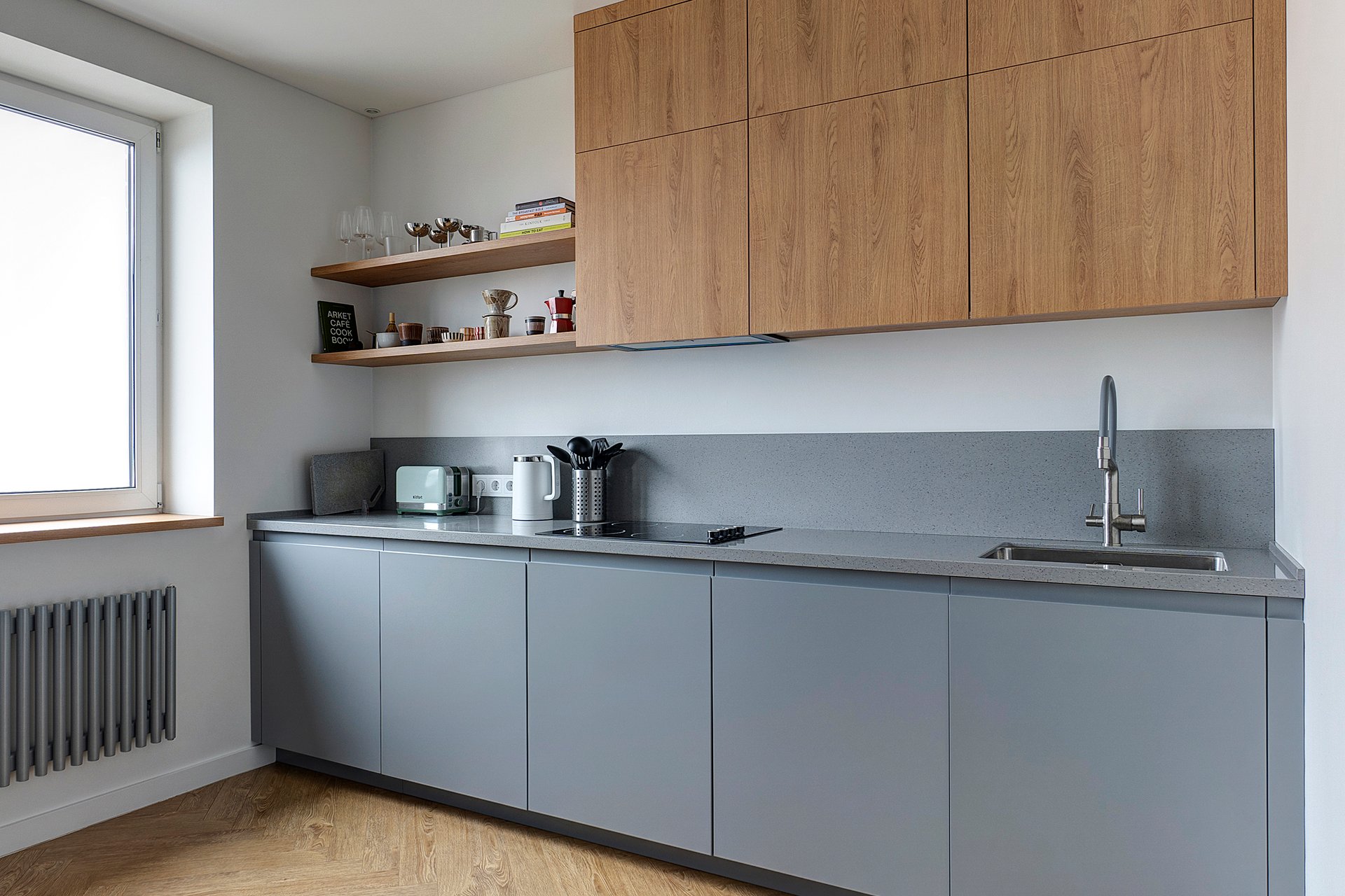 Планировкой мы занимались самостоятельно, а вот с расстановкой на кухне нам помогла моя подруга — дизайнер Екатерина Северова — и ее коллега Даниэла. Я мечтала о небольшом функциональном острове на кухне, но ее площадь совсем небольшая. Расширить кухню за счет лоджии было невозможно — это запрещено из-за пожарных норм. Катя убедила меня в том, что остров будет сильно мешать и съест много пространства, сделав каждый из проходов слишком узким. Поэтому от острова мы отказались и сделали барную стойку, которой разделили пространство гостиной и кухни. За ней мы, кстати, проводим больше всего времени, за большой стол пересаживаемся только по выходным или когда в гости приходят друзья.