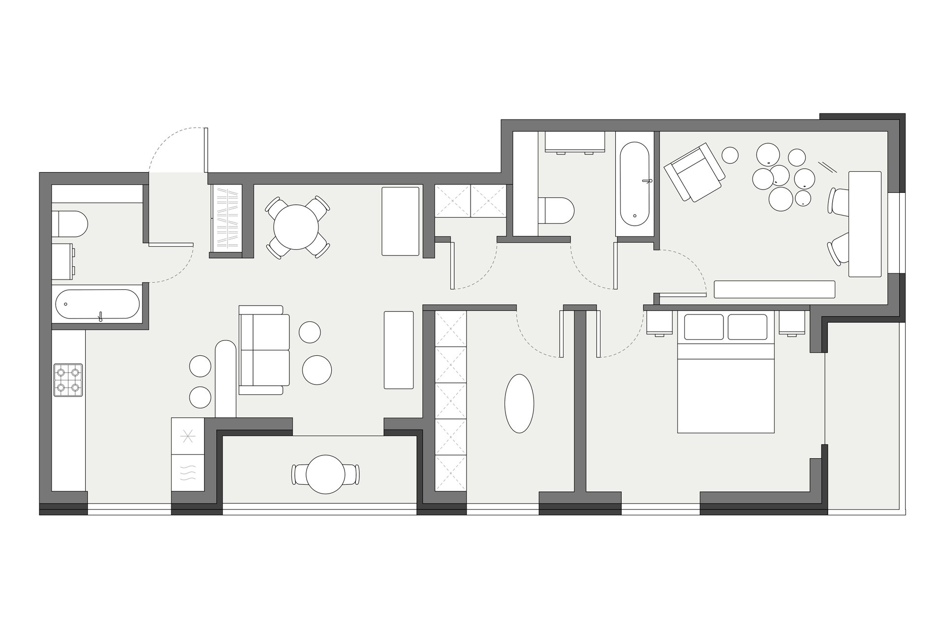 На момент покупки дом только строился. Благодаря объединению двух квартир удалось получить идеальное жилое пространство: гостиную, объединенную с кухней, и несколько изолированных комнат: спальню, кабинет, гардеробную, два санузла. Одна из прихожих стала постирочной. Перепланировки, кроме объединения, не было. По сути это две квартиры со снесенной между ними стеной, а одна из прихожих изолирована дверью и переоборудована в постирочную.