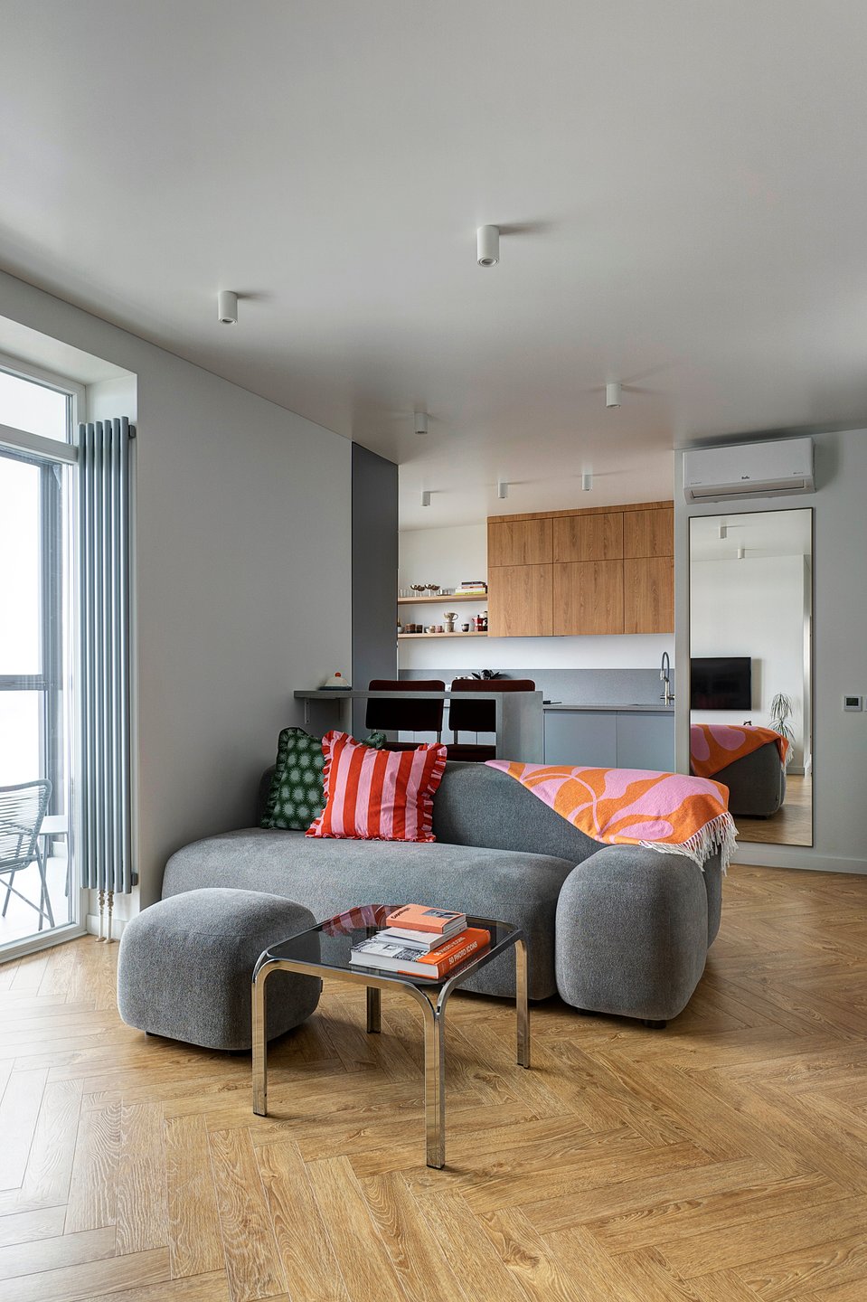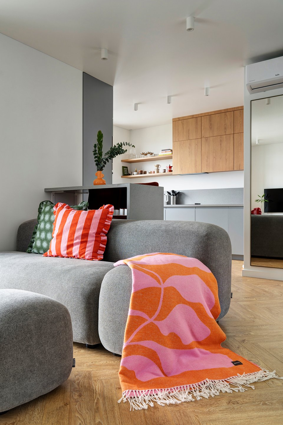 Диван Риббл от бренда divan.ru условно делит пространство на кухню и гостиную. Модель обтекаемой формы и небольшая — ширина прохода с ней абсолютно комфортная. А чтобы компенсировать отсутствие у дивана угловой части, мы купили еще и пуф из серии Риббл.