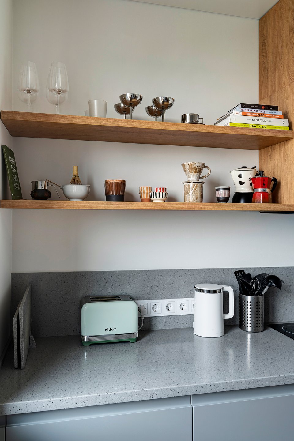 Кухня и барная стойка выполнены на заказ по моим чертежам. Здесь четыре нижних шкафа, в пятом расположена посудомоечная машина. Я не очень люблю верхнее хранение на кухне с визуальной точки зрения, но понимала, что в шкафы над и под духовой и микроволновой печами все бы не влезло. Поэтому я решила сделать только шесть узких верхних шкафов в том же цвете, что и пол, а рядом разместить полки, на которых стоит все, чем мы пользуемся каждый день: посуда для приготовления матчи, гейзерные кофеварки, воронка от «Полемики» и стаканы, сделанные моей подругой и привезенные из путешествий — для кофе и матчи. Барная стойка выполнена из того же материала, что и столешница.