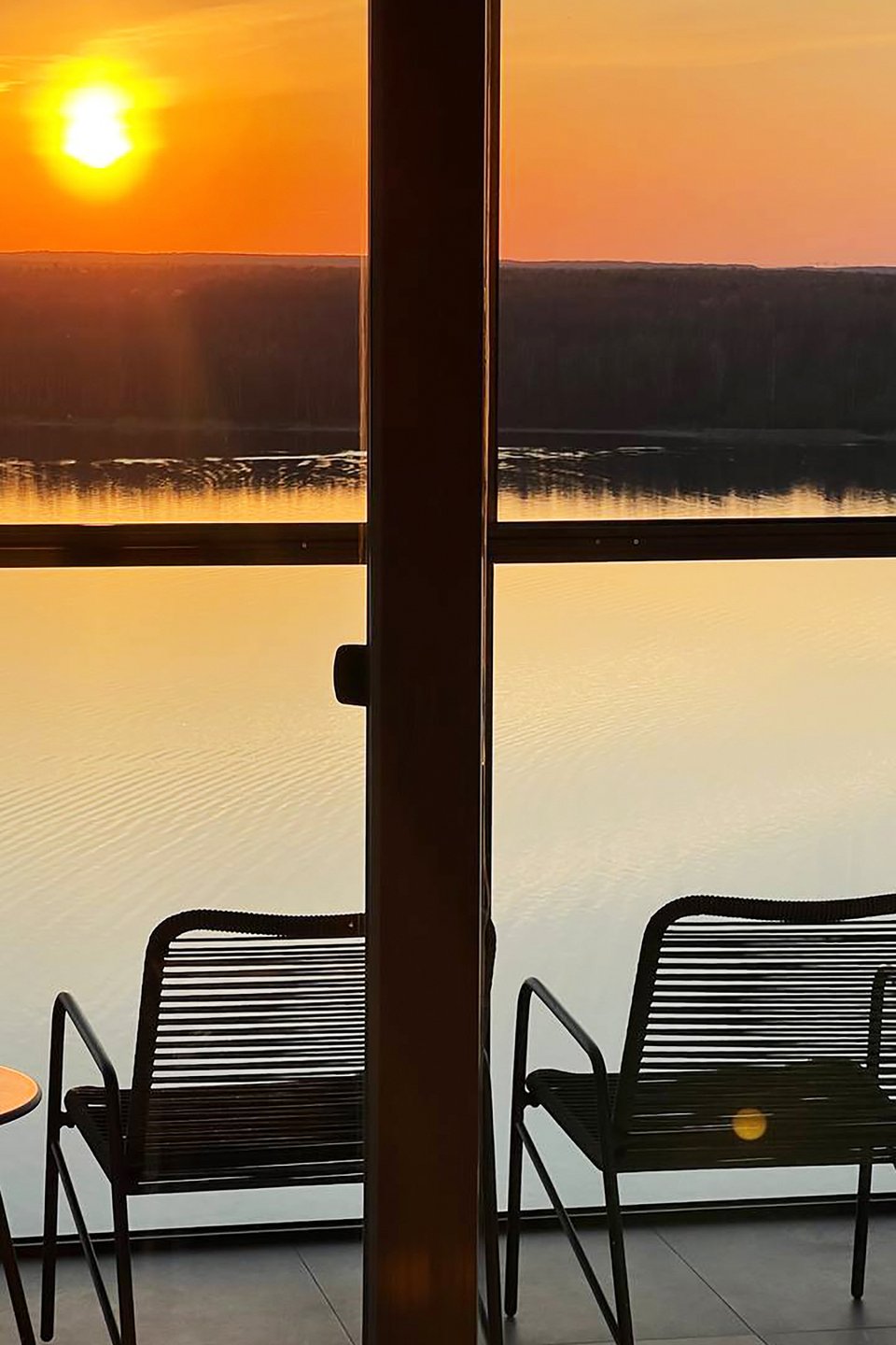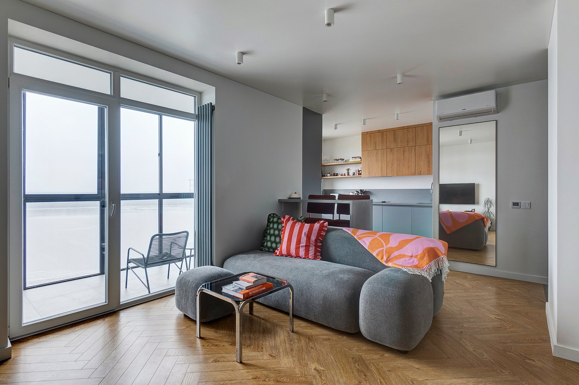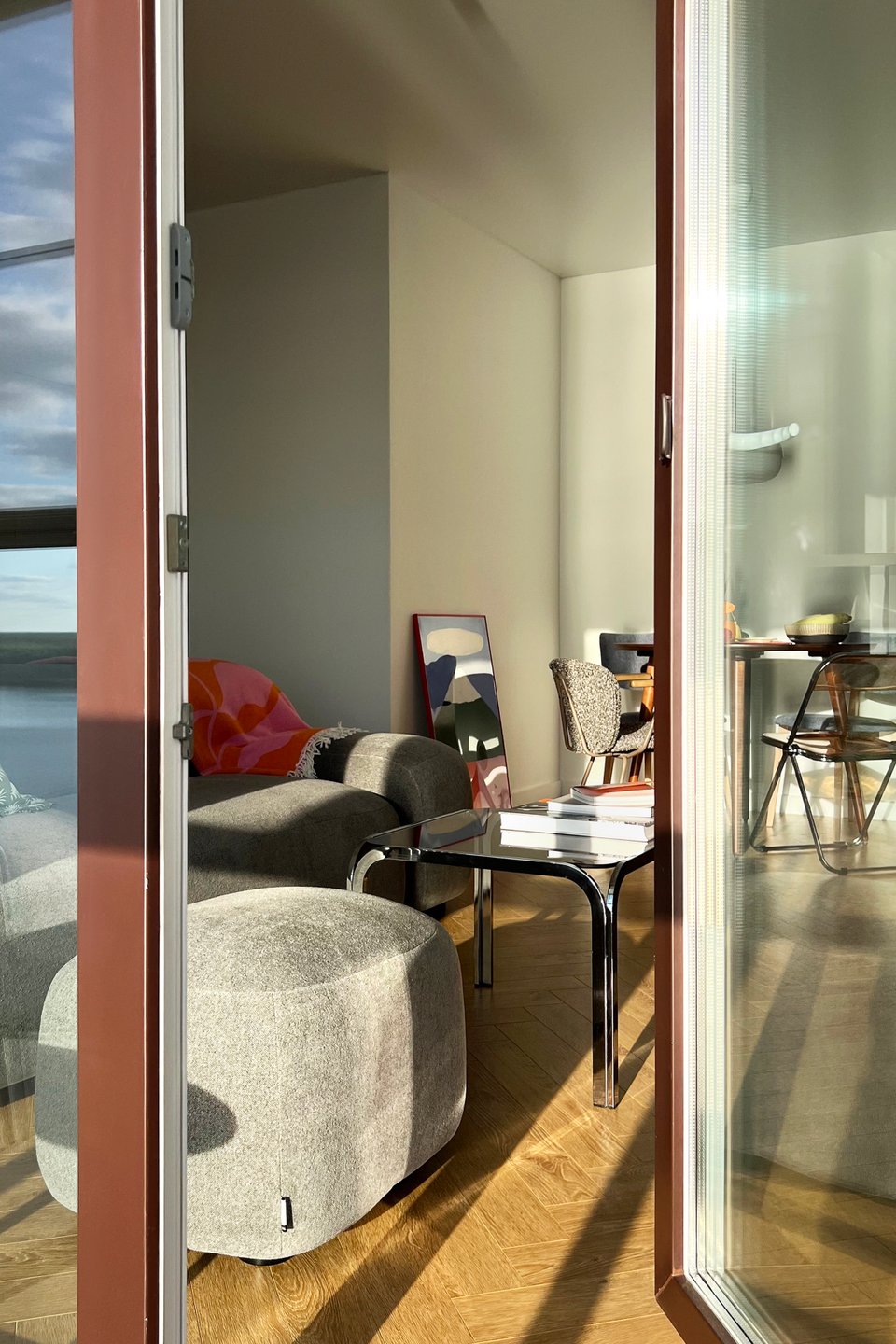 Лоджию отделали плиткой и покрасили стены в тот же цвет, что и во всей квартире, чтобы визуально увеличить пространство через панорамные окна. Учитывая вид из окон, мы хотели сделать на лоджии зону, в которой можно было бы пить кофе по утрам, читать и просто любоваться природой.