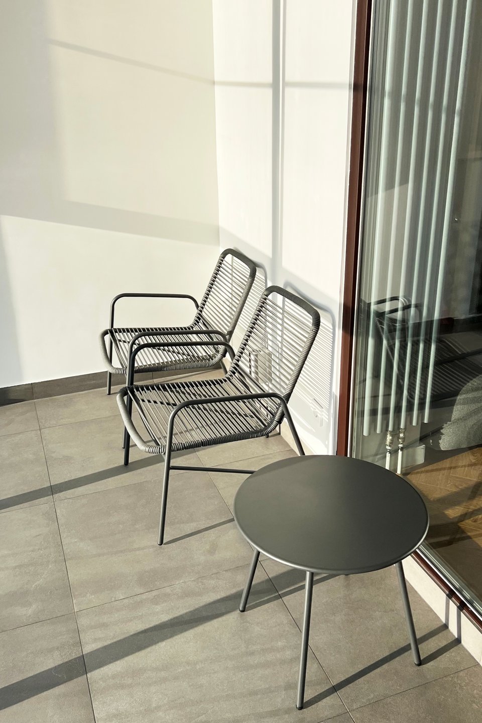 На лоджии стоит набор садовой мебели Кендра: два удобных стула и журнальный стол. Их преимущество в том, что прутья — это толстая нить, а не металл, сидеть на них приятно, мягко и не холодно.