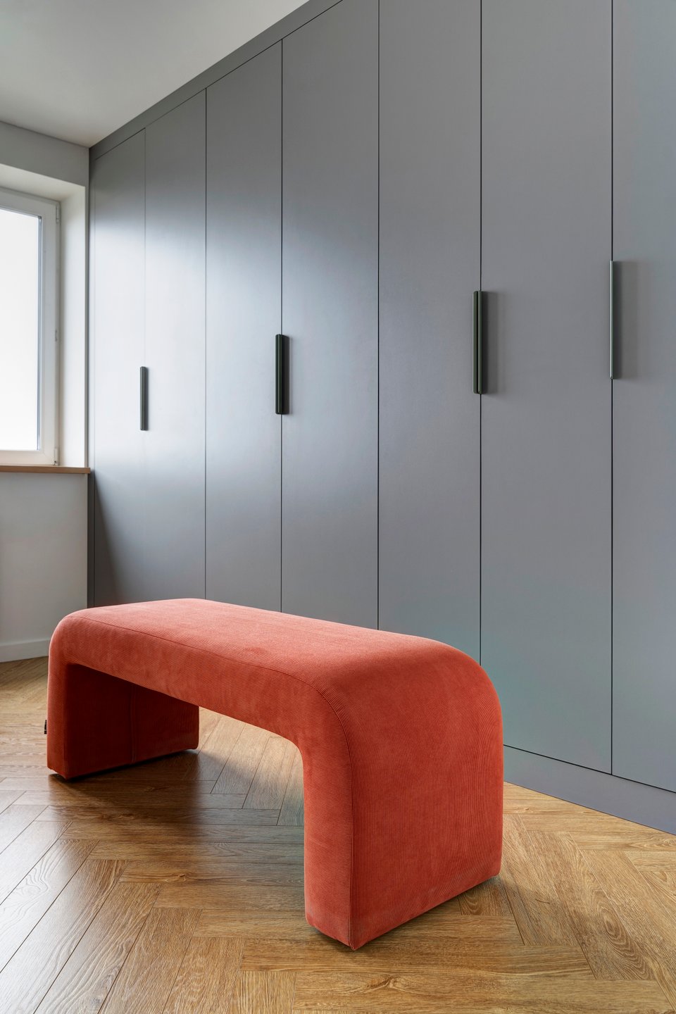 Одну комнату мы решили полностью отдать под гардеробную. Установили шкаф во всю стену, выполненный на заказ из того же материала, что и шкаф в прихожей, сделали акцентные ручки. Напротив повесили большое зеркало и поставили банкетку Ринт от divan.ru. На нее удобно класть вещи, сумку, садиться, примеряя обувь. И делать классные селфи. Она легко перемещается по комнате, когда нужно расстелить коврик для йоги или поставить сушилку с бельем. Ткань обивки подобрали в «Конструкторе мебели» на сайте.