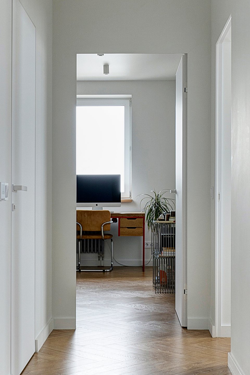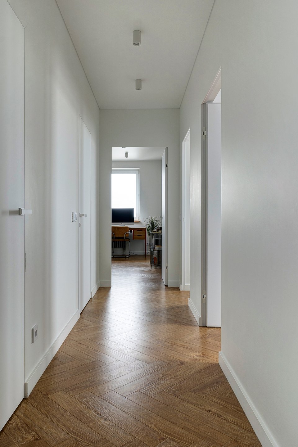 На пол в комнатах уложили ламинат в оттенке «дуб», рисунок «венгерская елочка». Стены покрасили в белый цвет, установили широкий плинтус. Все радиаторы заменили.