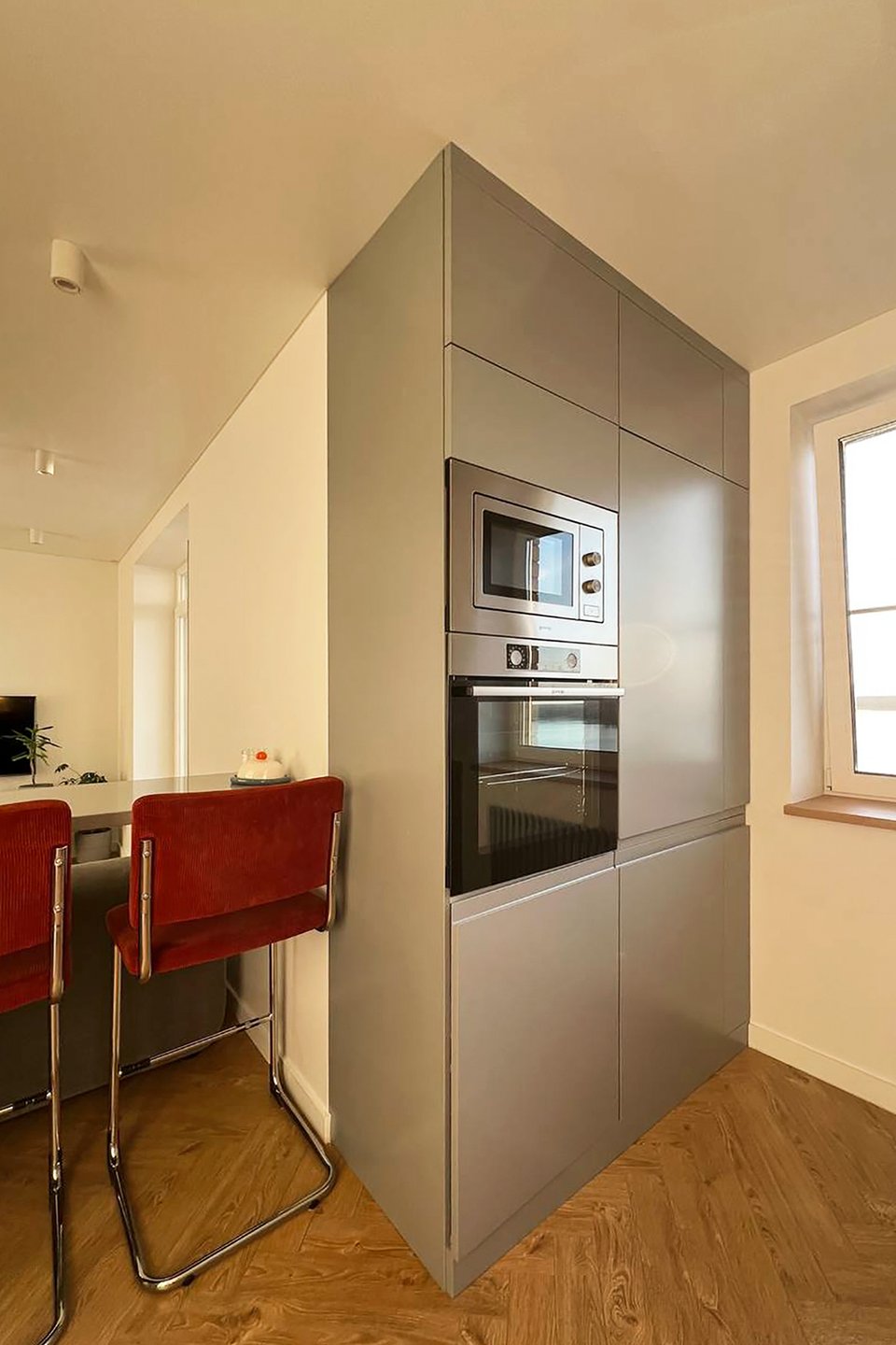 Напротив — еще один ряд гарнитура с пеналами до потолка. Здесь находится холодильник, духовка и СВЧ-печь.