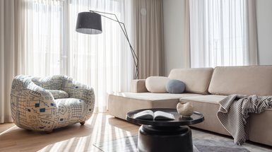 На фото: кресло подобрано по высоте к дивану. Интерьер квартиры 72 кв.м в г. Сочи, п. Красная Поляна, дизайнер Евгения Куликова; фотограф: Виола Заварзина