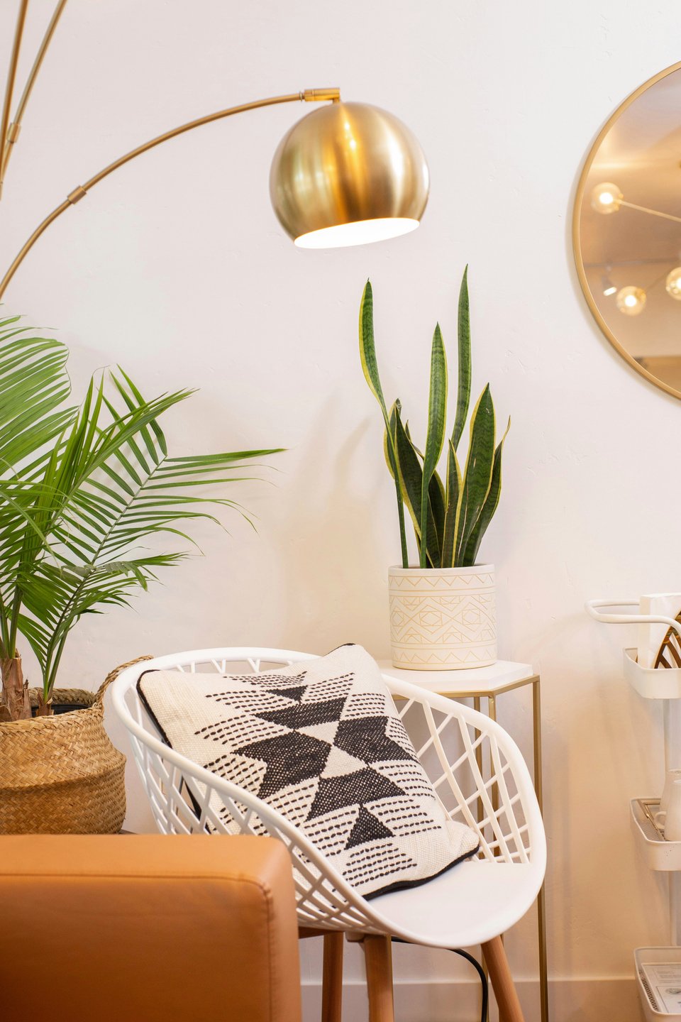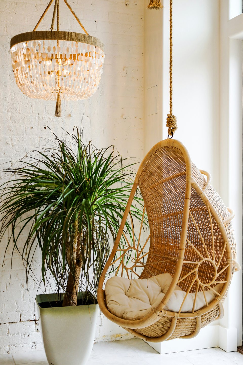 Казалось бы, это полные противоположности, но в богемском стиле интерьера можно реализовать и такую концепцию. Основа — светлый нейтральный фон (белые стены, светлое дерево), на котором выделяются 2–3 ярких акцента: например, узорчатый ковер, крупное растение и подвесной плетеный гамак. Тут правит бал простота и функциональность, количество мелкого декора максимально ограничено, ткани нейтральных оттенков приятные в тактильном плане, керамика ручной работы.