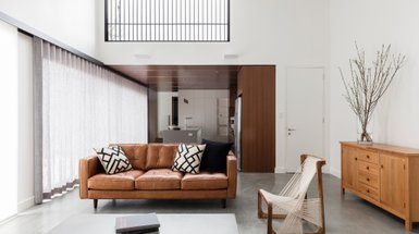 Диван в стиле джапанди — необязательно кожаный, но всегда невысокий, простой формы и в натуральных оттенках