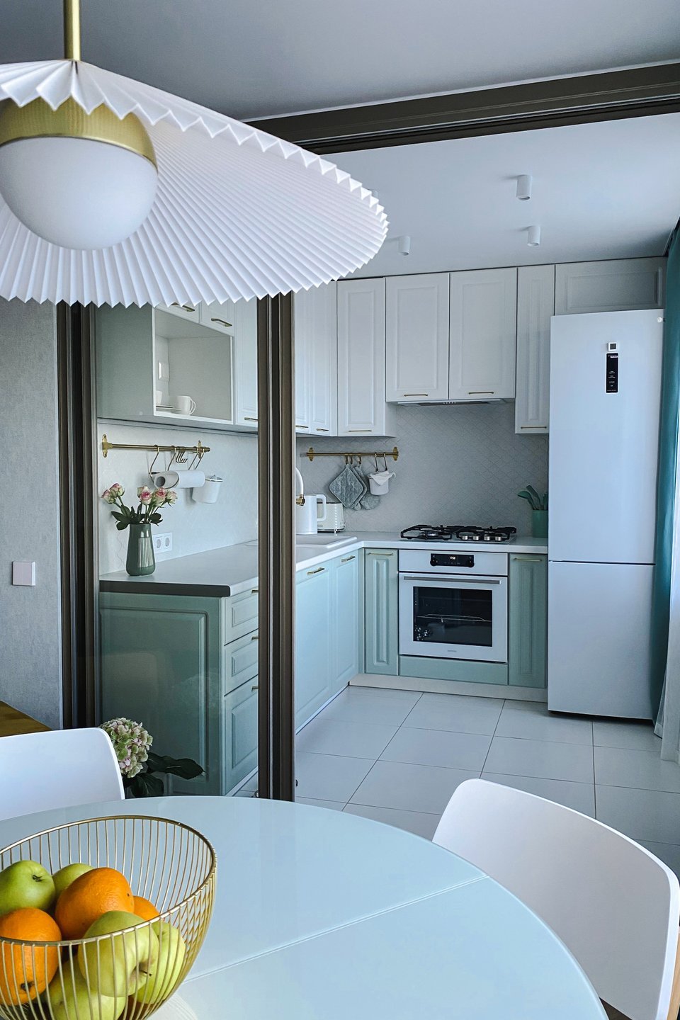 Мы уже потеряли всякую надежду найти что-то подходящее, и вдруг я случайно нашла в интернете питерскую компанию «Оливковая ветвь». Это единственная компания, в которой был такой большой выбор пленок. Среди них был тот самый мятный цвет, который у нас на нижних фасадах, а верх мы сделали белым. Ручки заказывали отдельно. Встроенный холодильник мы не рассматривали, так как они очень маленькие внутри и сильно дороже обычных. И еще важный момент: один только шкаф для встроенного холодильника стоит 40 000 – 50 000 руб. В итоге кухня обошлась нам в 108 000 руб. Фартук выложен плиткой Керама Марацци Арабески.