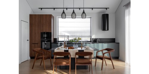 Она формирует строгий архитектурный образ кухни и подчеркивает геометрию пространства, а промежуточные оттенки смягчают контрастность и делают помещение уютным и «жилым».