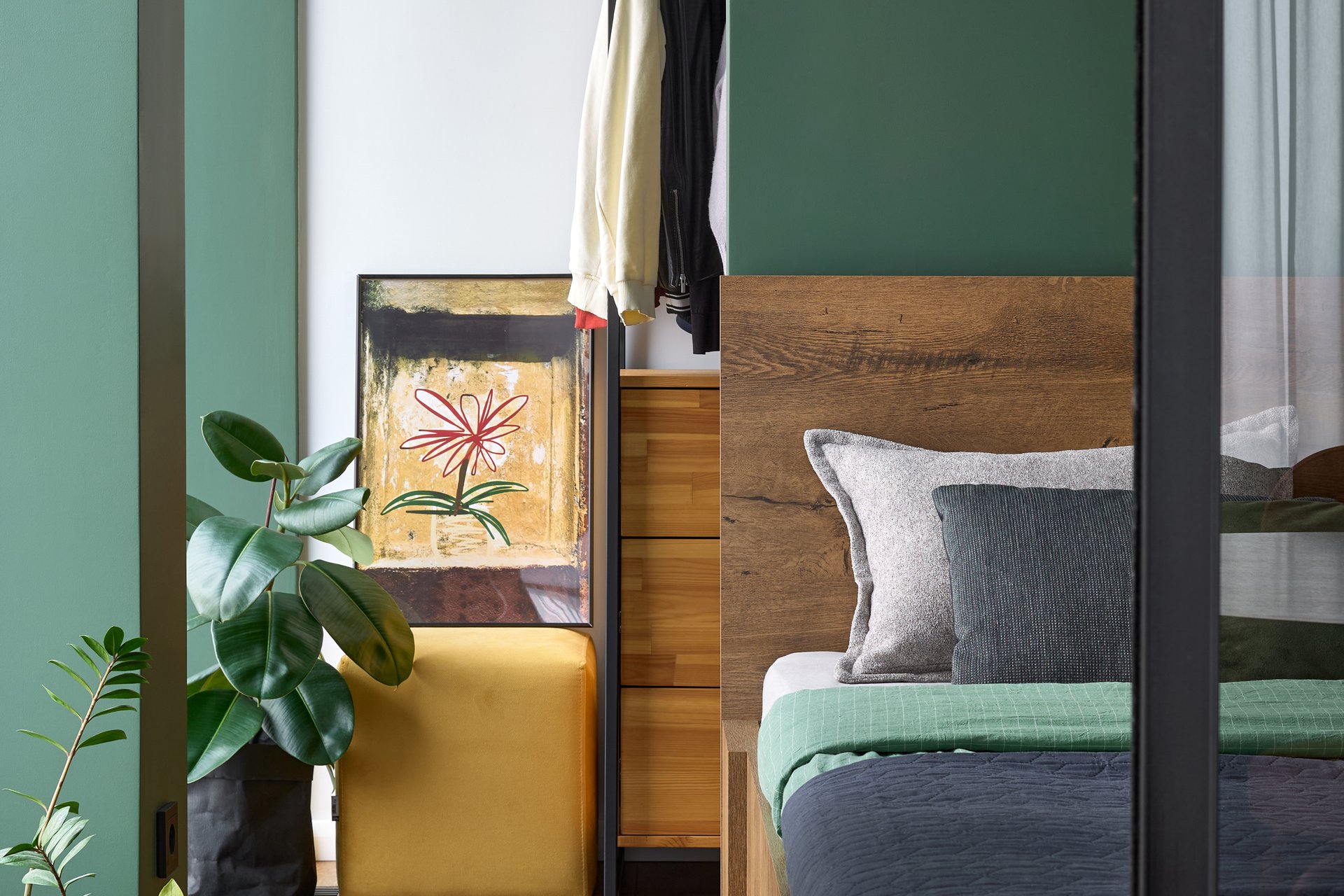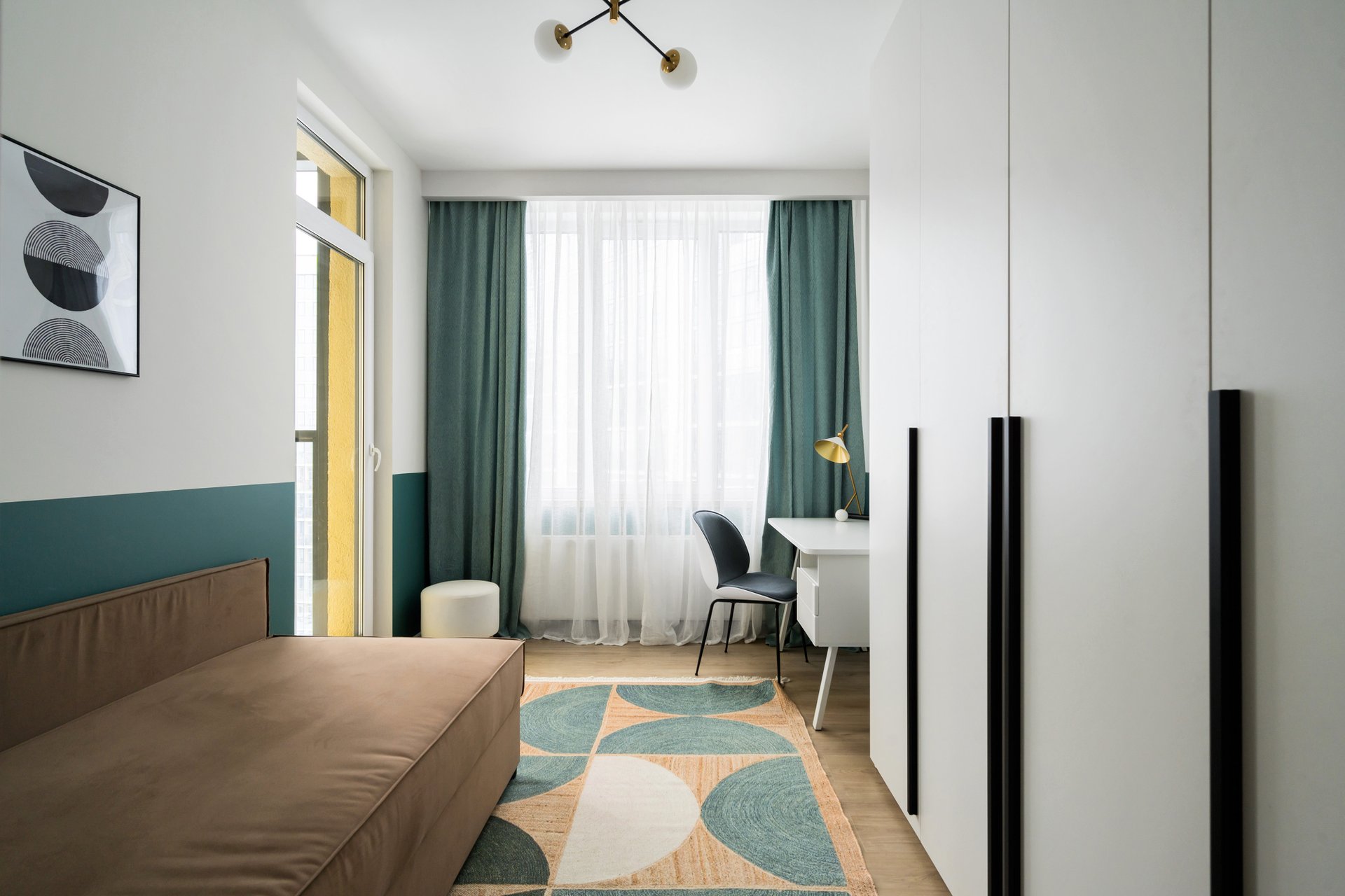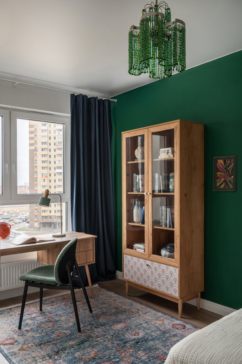 Здесь этот цвет часто выступает как главный акцент на фоне сдержанной базы. Подойдет один крупный зеленый объект (кровать, шкаф, кресло) и несколько более мелких цветных деталей. Такое пространство не выглядит пестрым, но сохраняет характерную аккуратность дизайна.