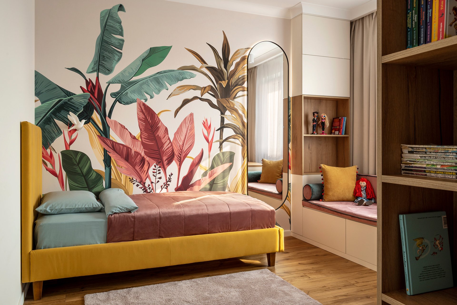 - Связывает с природой, напоминая о густой листве, траве и лесе. Это особенно важно в городских квартирах, где не хватает зеленых видов из окна.