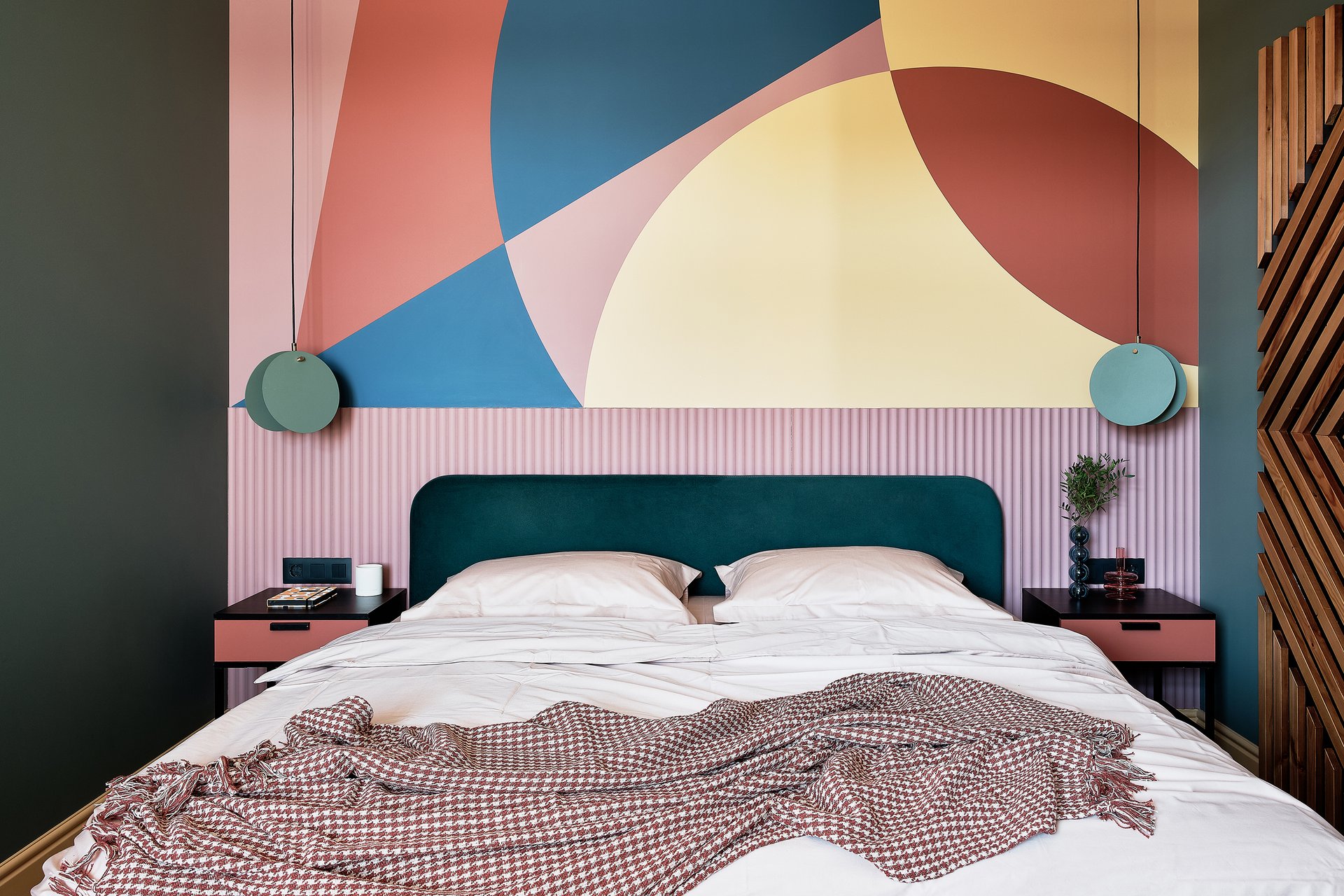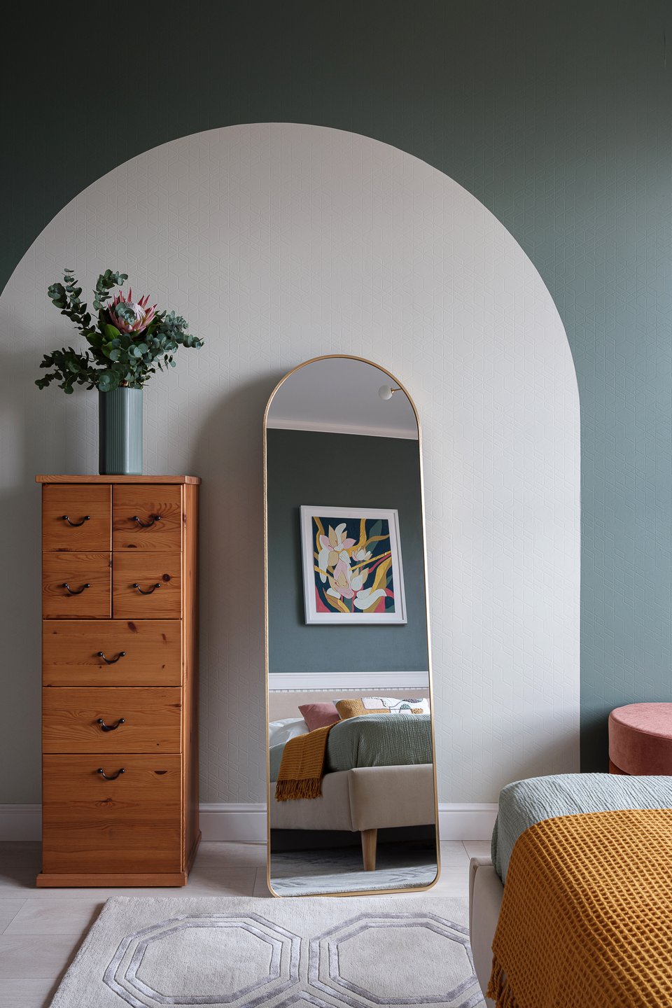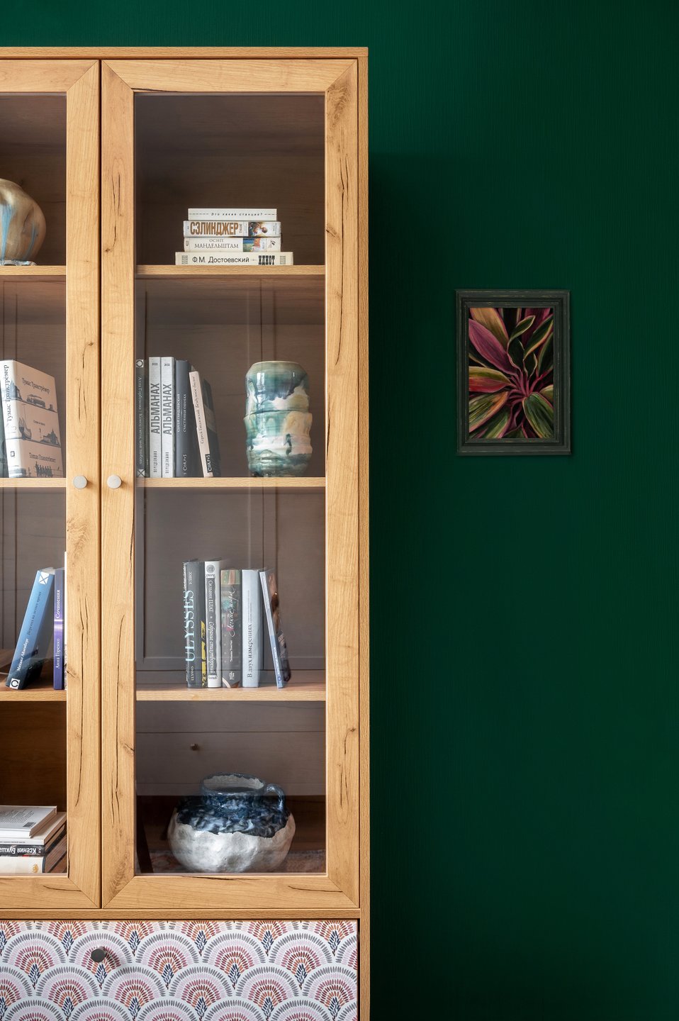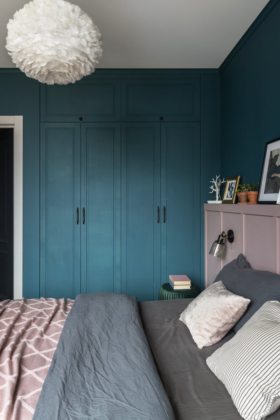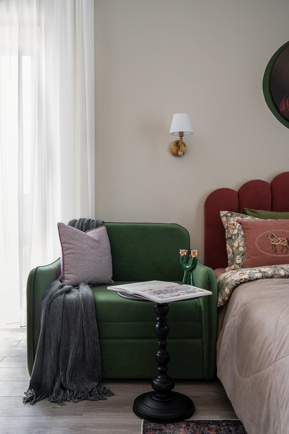 Лучше использовать его дозированно: акцентные поверхности, небольшие предметы или текстиль. Вопреки распространенному мнению, сочетание изумрудного цвета в интерьере спальни со светлой мебелью (кроватью или диваном), а также комбинация с нейтральными тонами не сужает комнату, а наоборот, добавляет ей глубину и делает обстановку более выразительной.