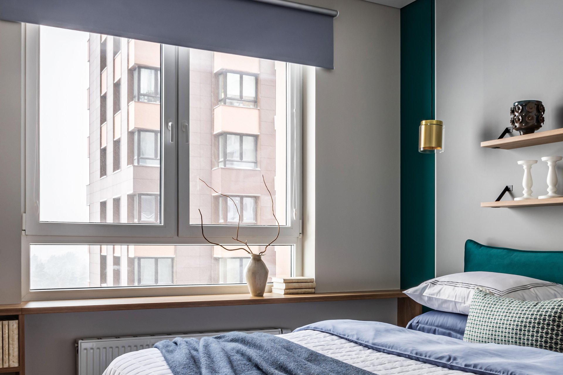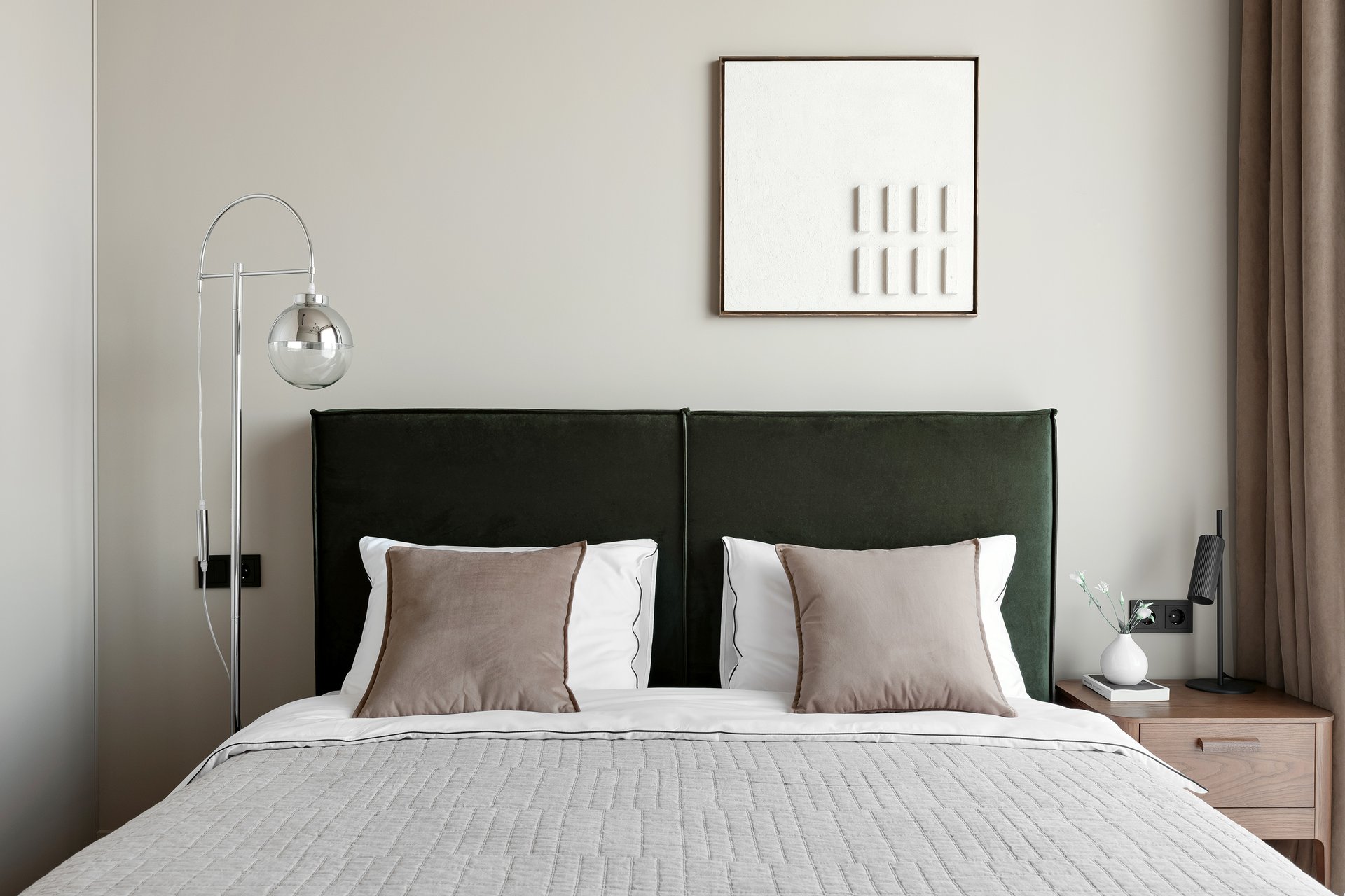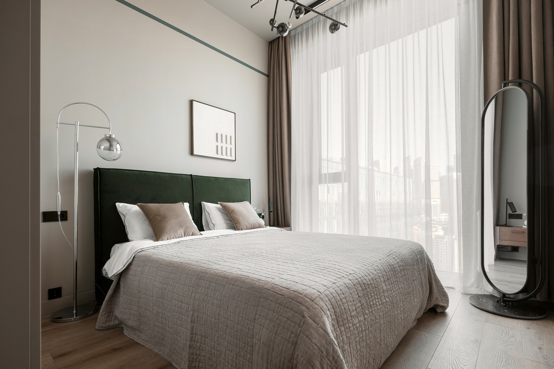 Рабочая формула: 60 % базовых тонов (стены, крупная мебель) + 30 % изумрудных (шторы, покрывало, подушки) + 10 % дополнительных акцентов (металл, дерево, цветовой контраст).