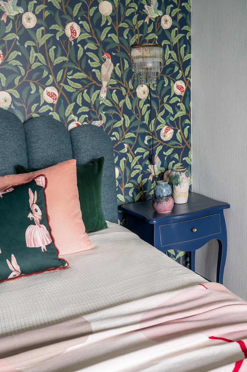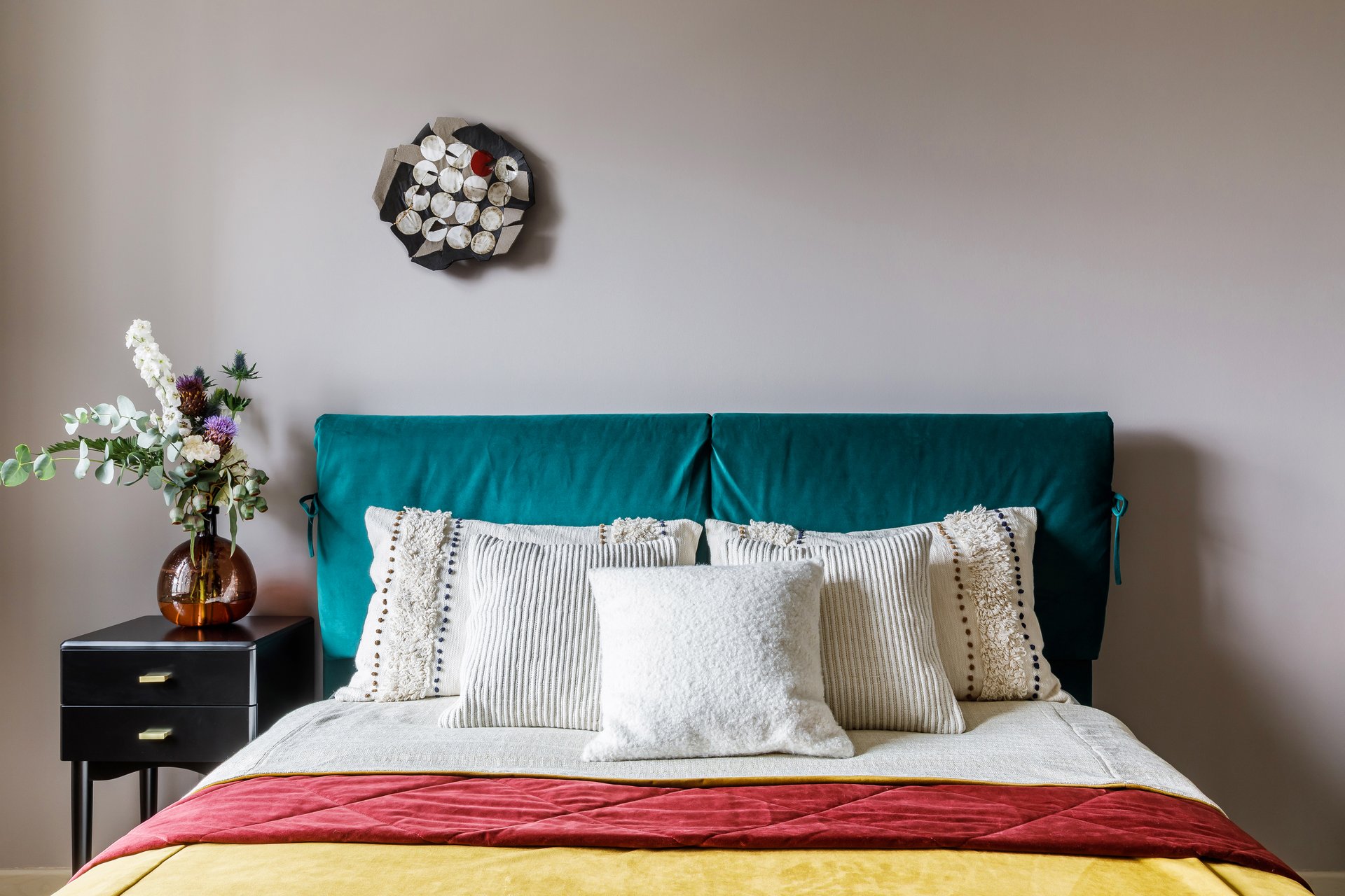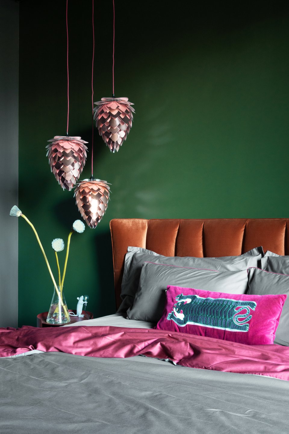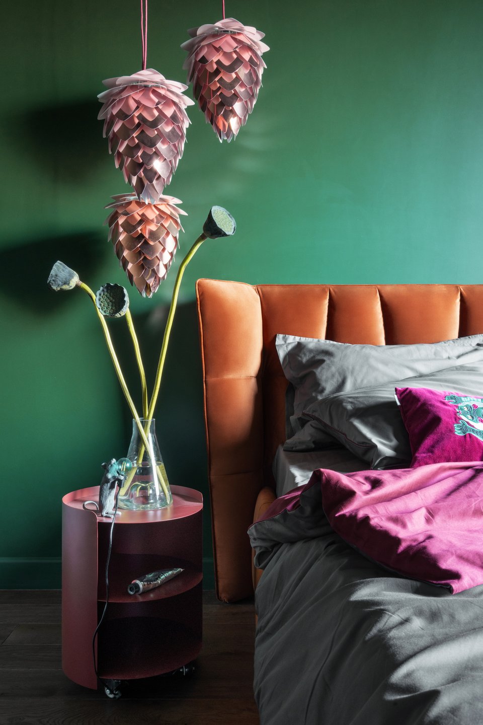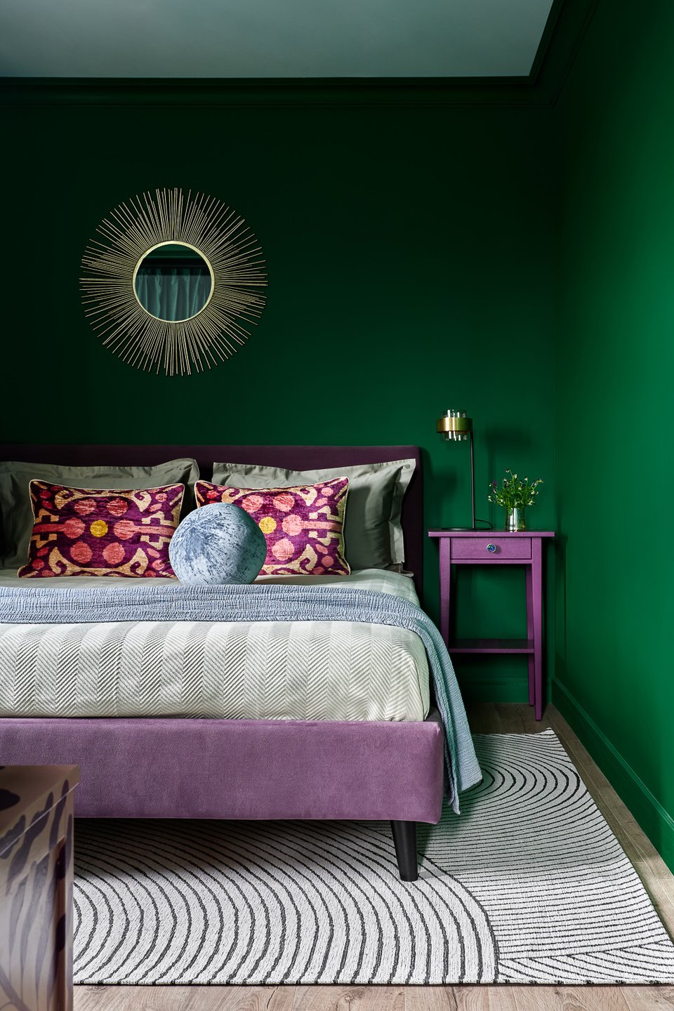 Если вы не готовы красить стены, изумруд в спальню легко ввести через детали: