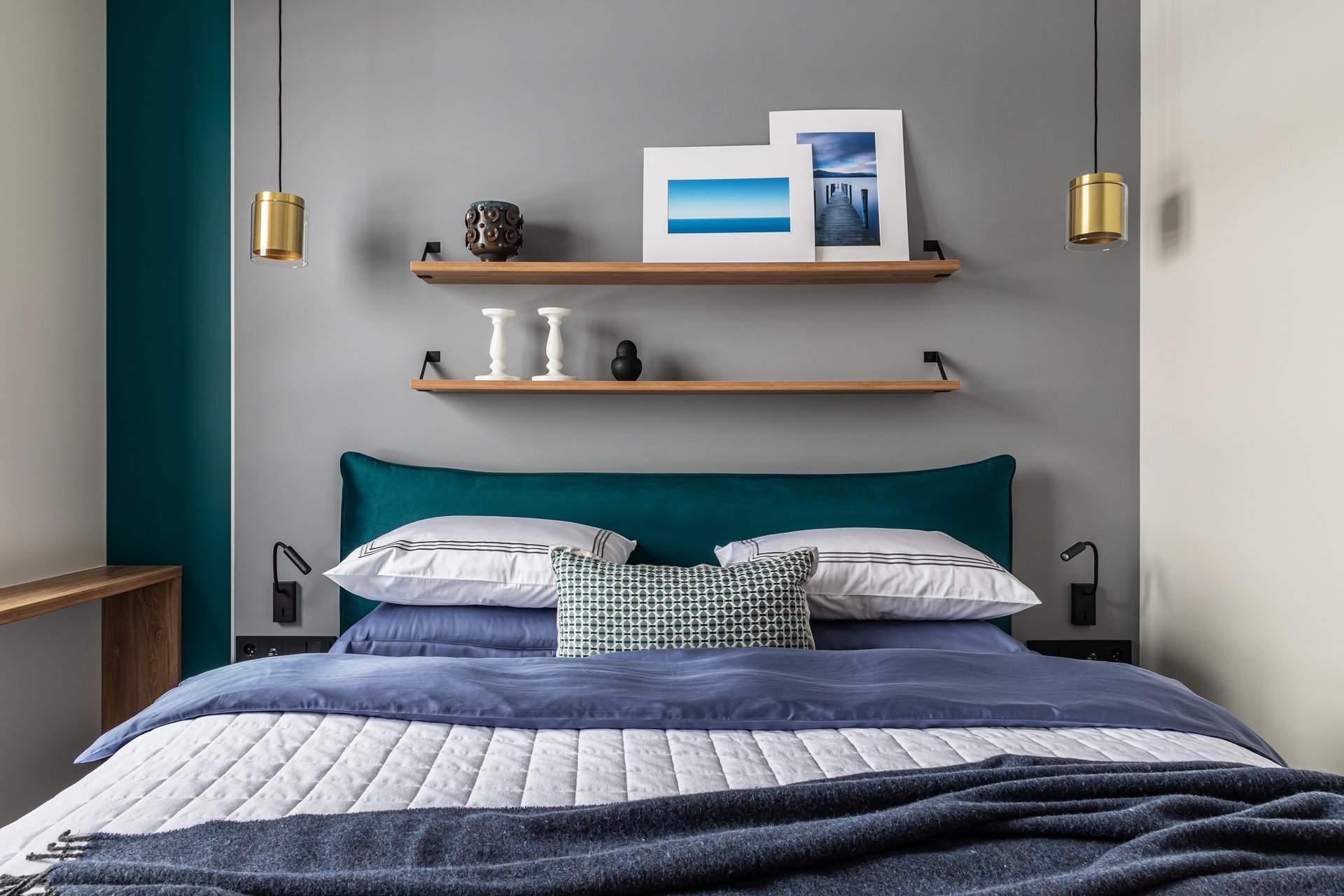 Хорошо смотрится прием, когда поверхность за изголовьем окрашена в приглушенный цвет, а остальное пространство светлое. Образ дополняют «мягкие» детали: натуральное дерево, теплый желтый металл. В результате комната остается просторной и воздушной, но выглядит более завершенной и выразительной.
