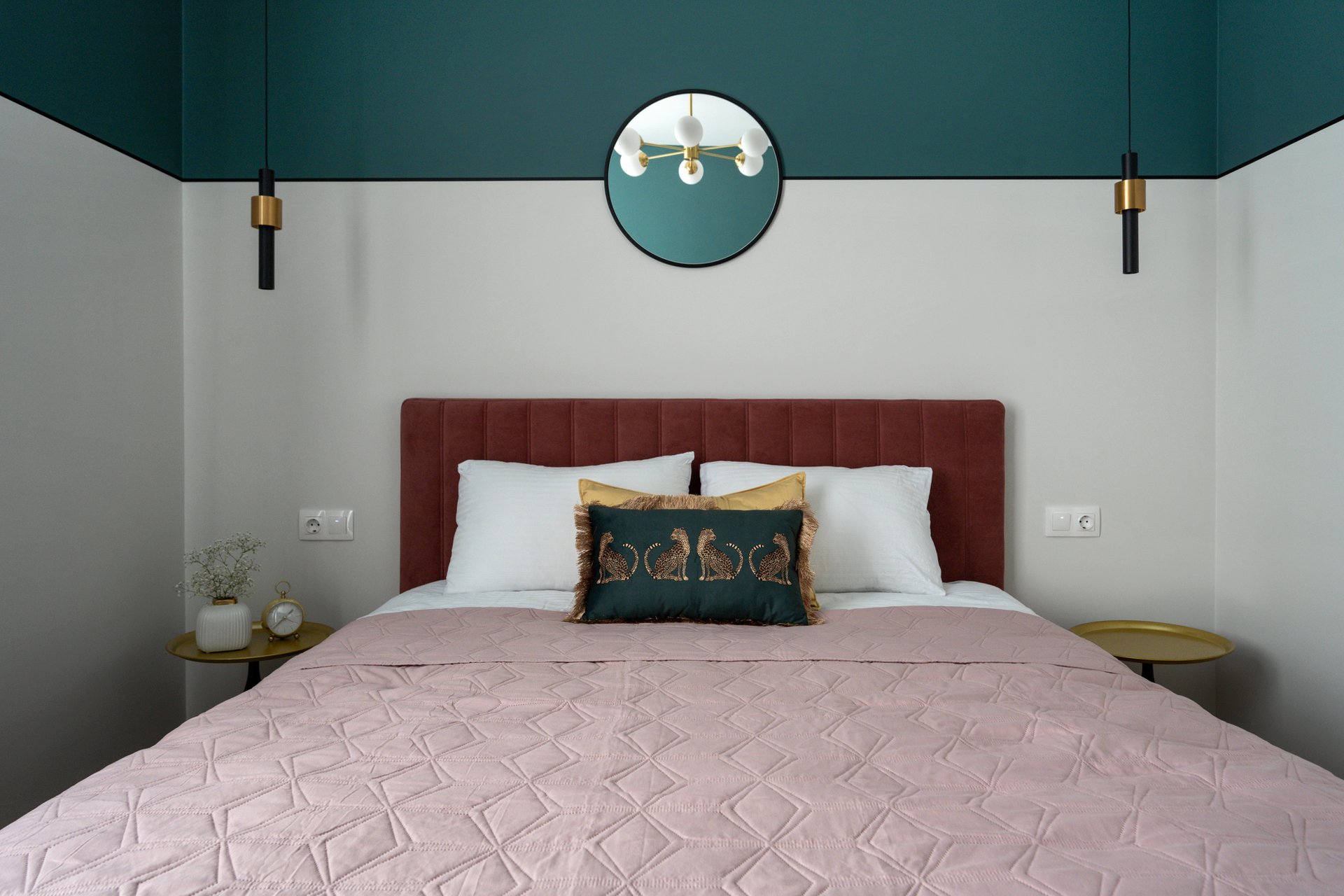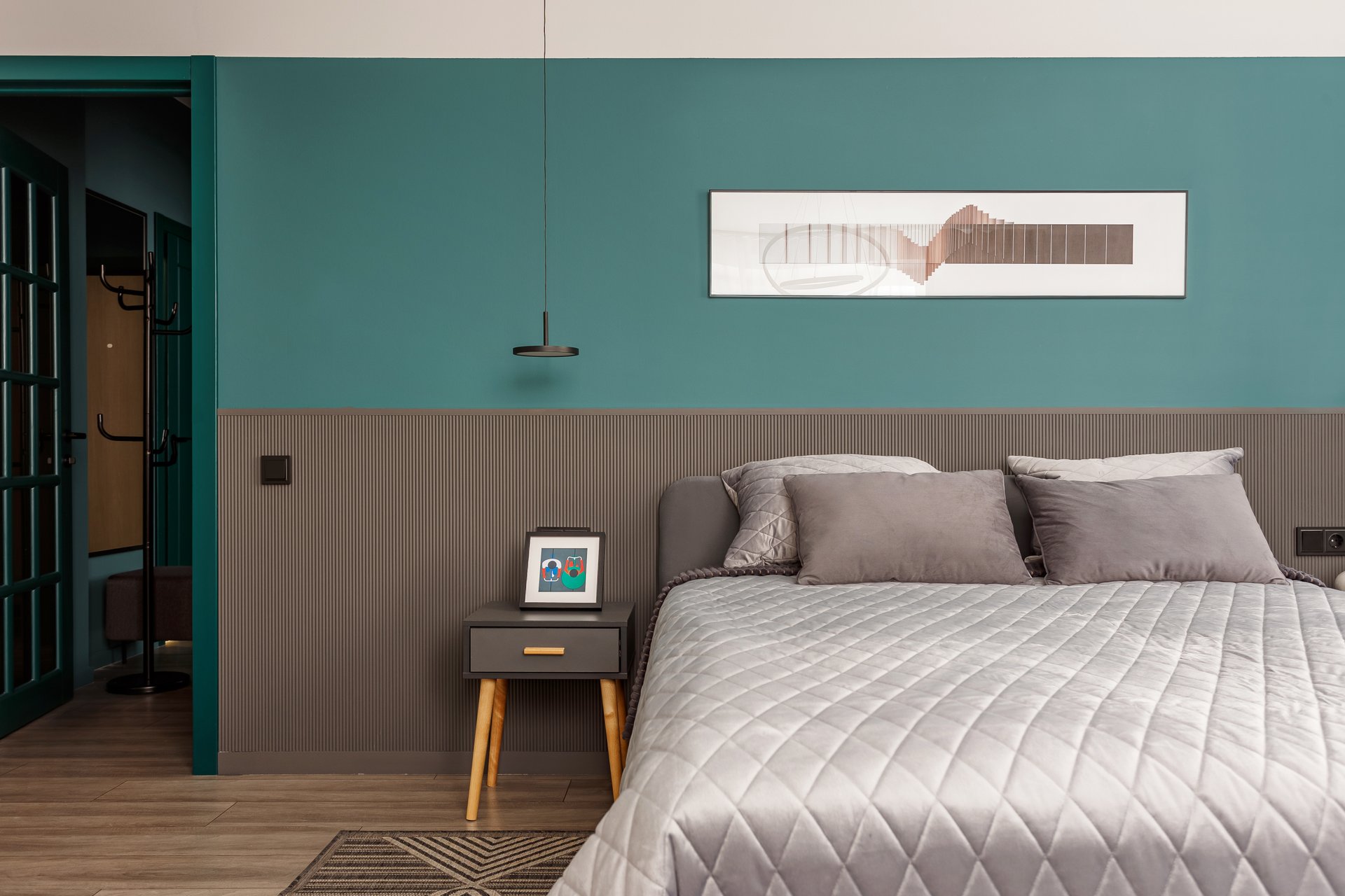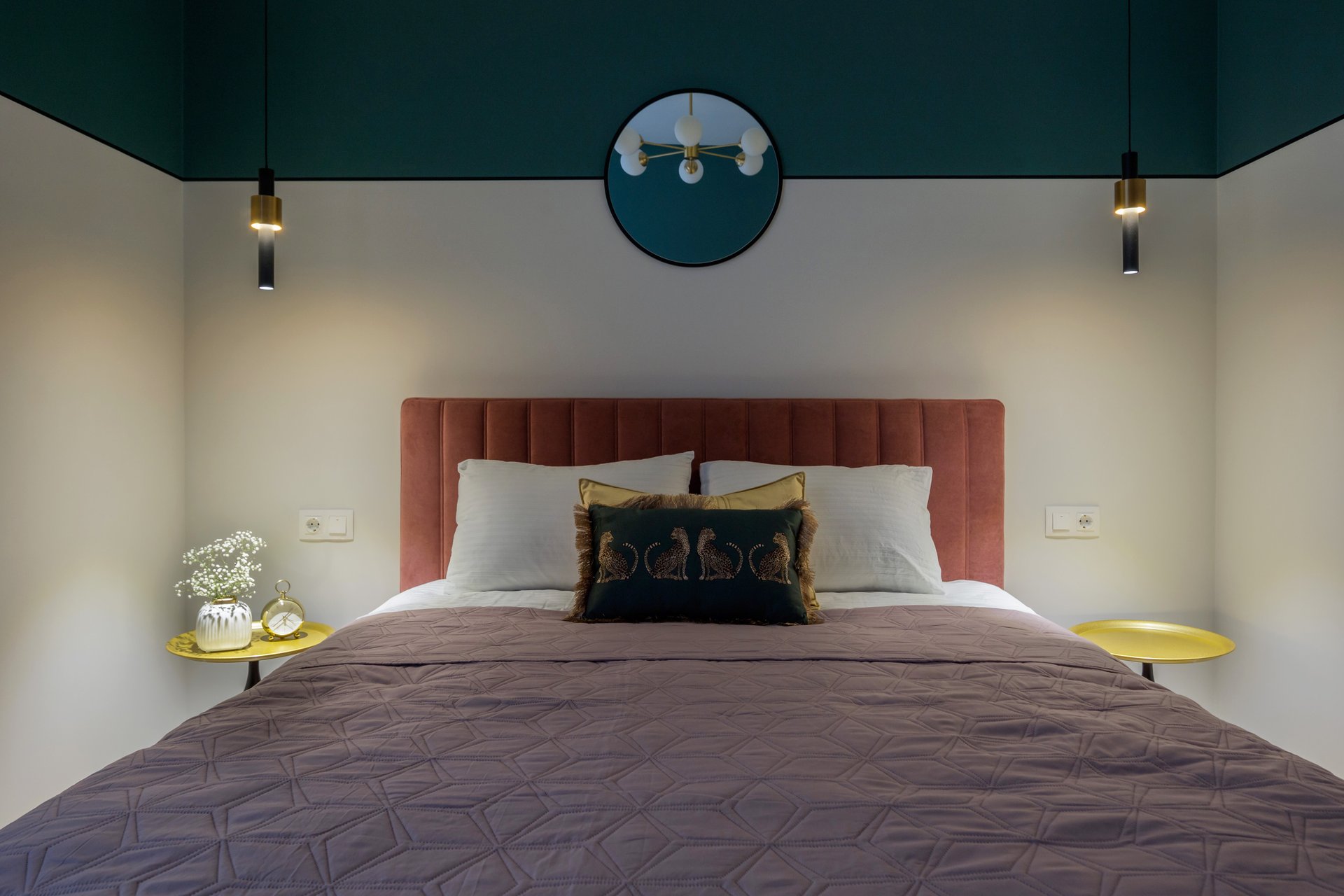 - Изумрудный цвет придает спальне благородство, глубину и выразительность, создавая атмосферу уюта и расслабления.