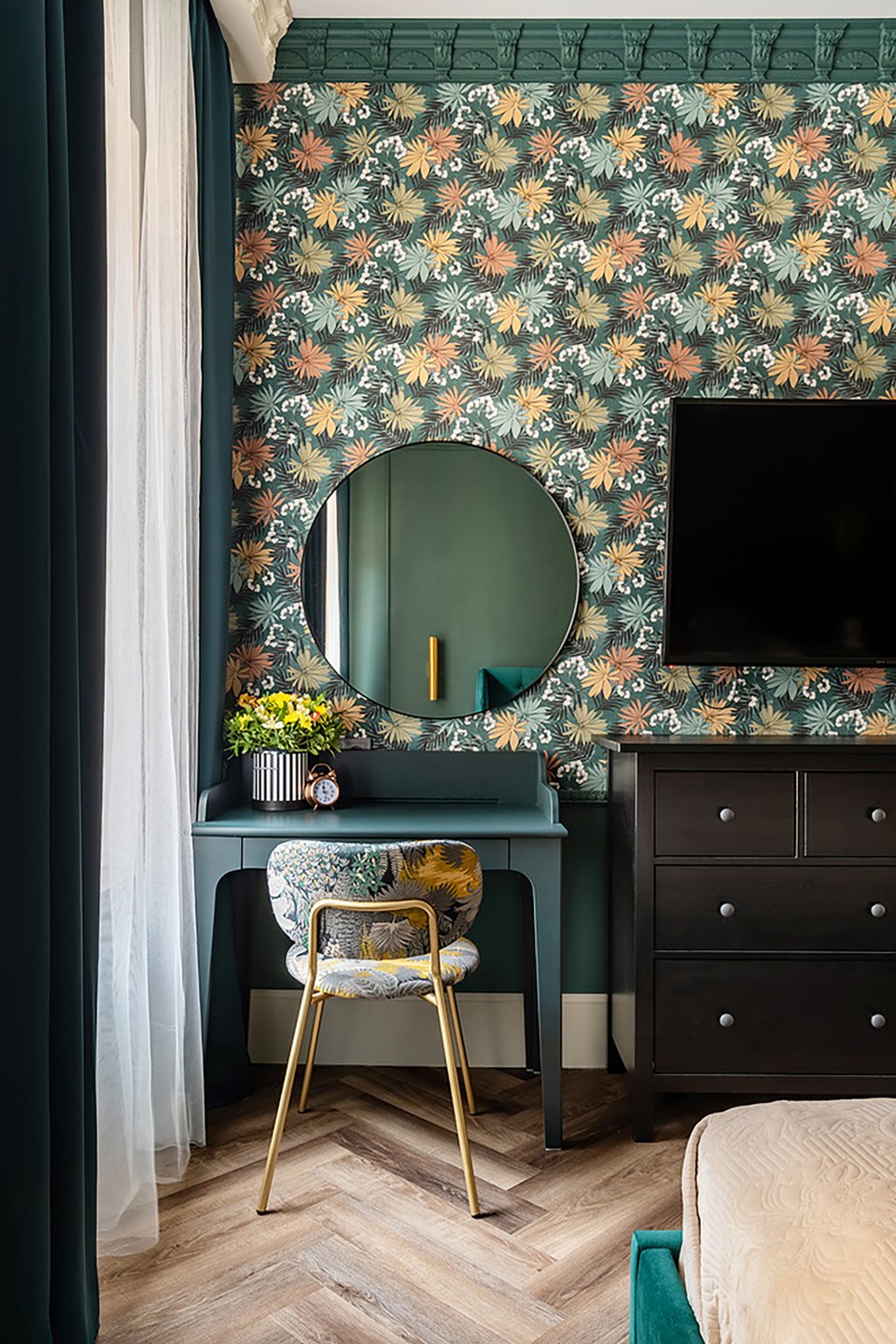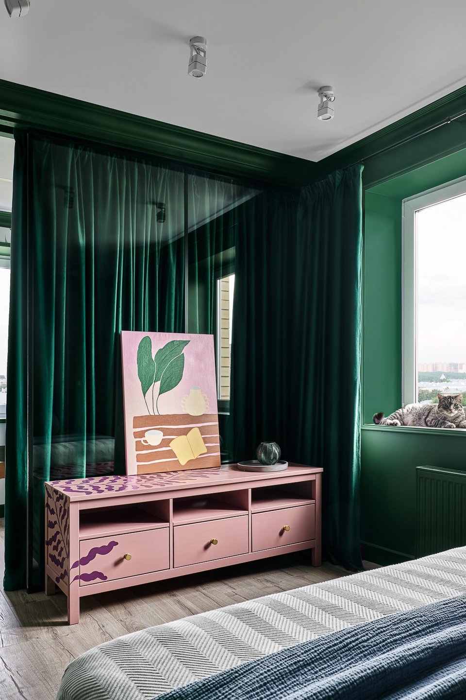 Подходит тем, кто любит визуально «обволакивающие» пространства. Здесь глубокий зеленый обычно используют в отделке стен и расцветке крупной мебели, дополняют темным деревом, графитовыми или черными акцентами. Чтобы пространство не выглядело слишком тяжелым, добавляют светлые элементы: постельное белье, ковер, отдельные декоративные детали.