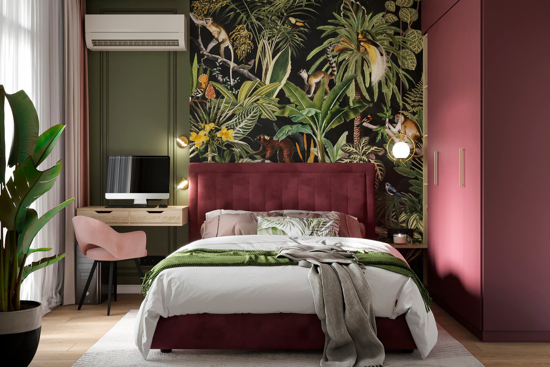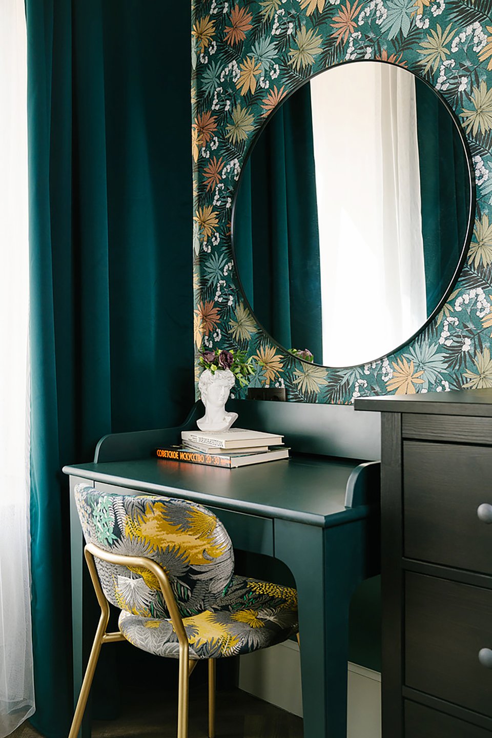 Изумруд — это один из самых удачных решений для такого оформления. Особенно эффектно он смотрится в сочетании со светлыми оттенками: белым, бежевым или кремовым. Хороший вариант — оклеить акцентную стену в спальне изумрудными обоями с «пальмовым» узором, поддержать мотив зелеными подушками и пледом, а остальные поверхности оставить нейтральными.