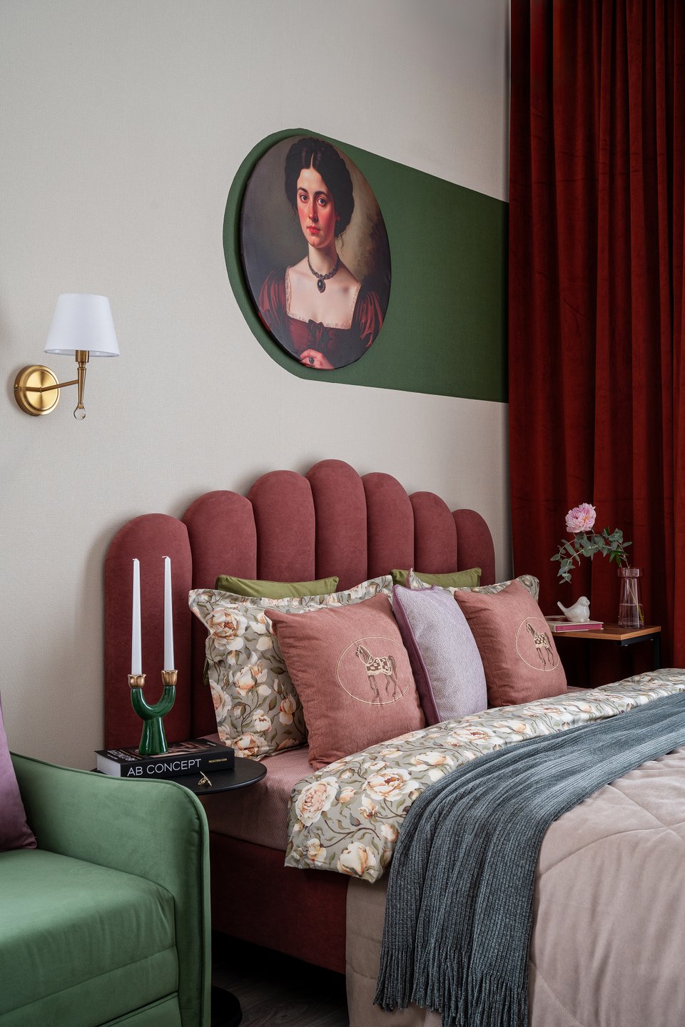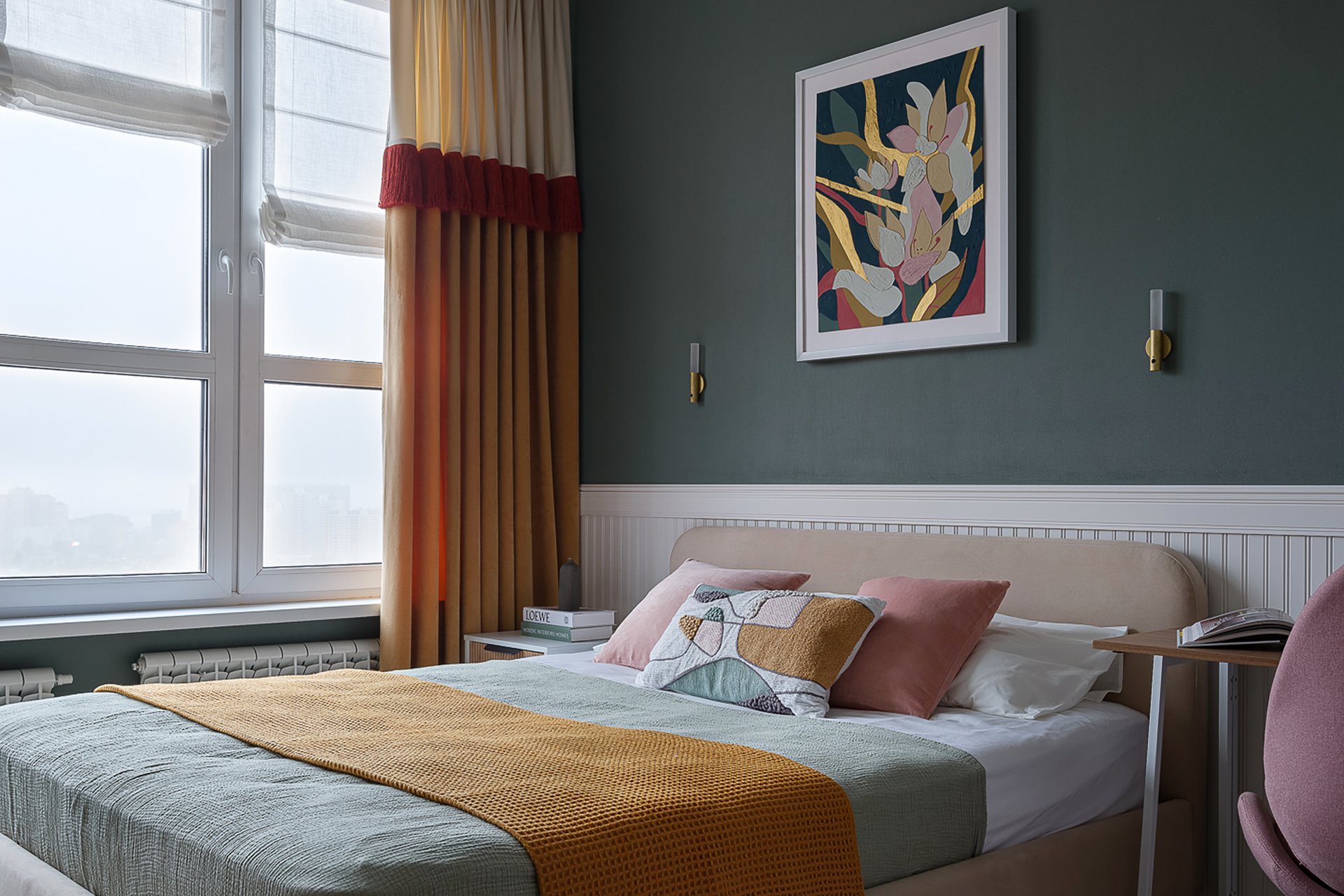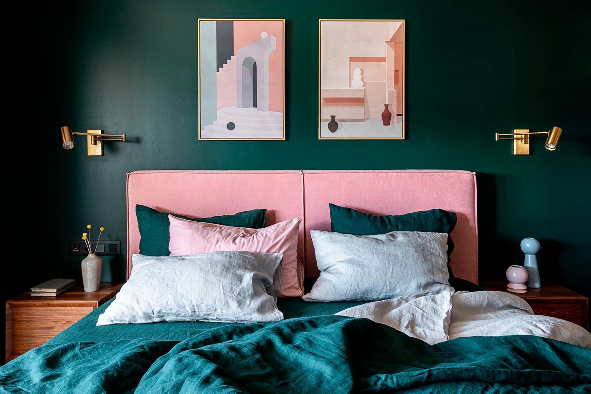 Вариант для тех, кто хочет легкую и романтичную спальню. Пудровый оттенок смягчает насыщенный зеленый, делает его нежным и менее строгим. Коралл добавляет композиции яркости и энергичности. Главное — вводить его дозированно, чтобы комната для сна не стала слишком активной.