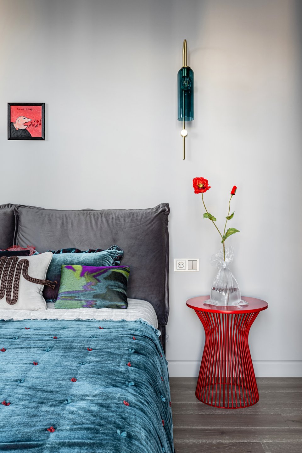 - Насыщенность. Чистый и яркий цвет — выразительный и эффектный, но в большом количестве может утомлять. Его лучше использовать точечно: за изголовьем, на шторах, в кресле. Приглушенный, с примесью серого — идеален для покраски больших поверхностей: смотрится благородно, не надоедает и становится хорошим фоном для мебели и текстиля.