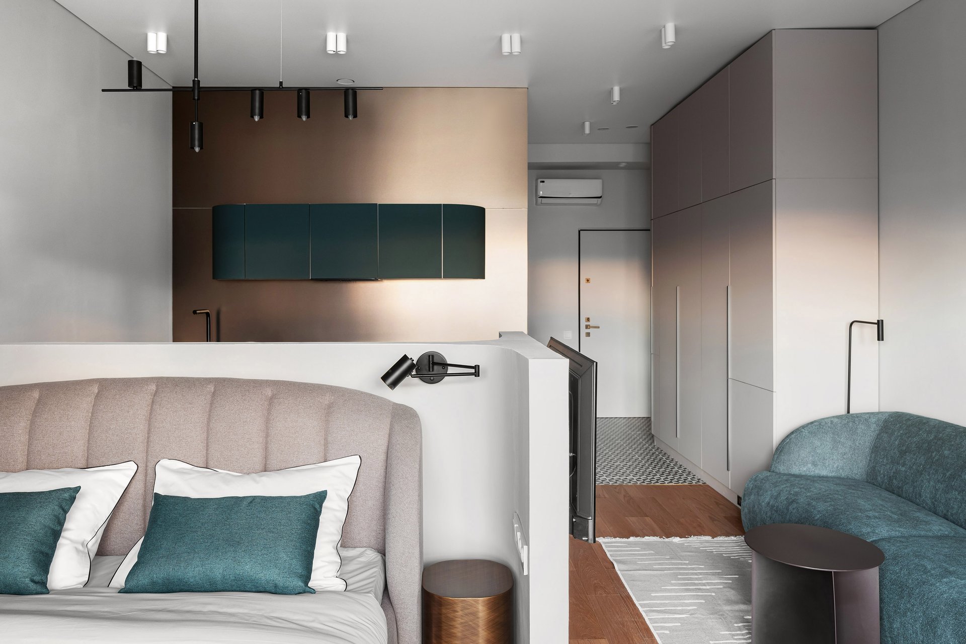 - На фото 2: студия 33 кв.м, ЖК «Джаз». В кадре диван прямой Виенсо от divan.ru. Дизайнеры: Юнна Лукинских и Евгения Ануфриенко, студия Yuloo Studio; фотограф: Роман Алексеев