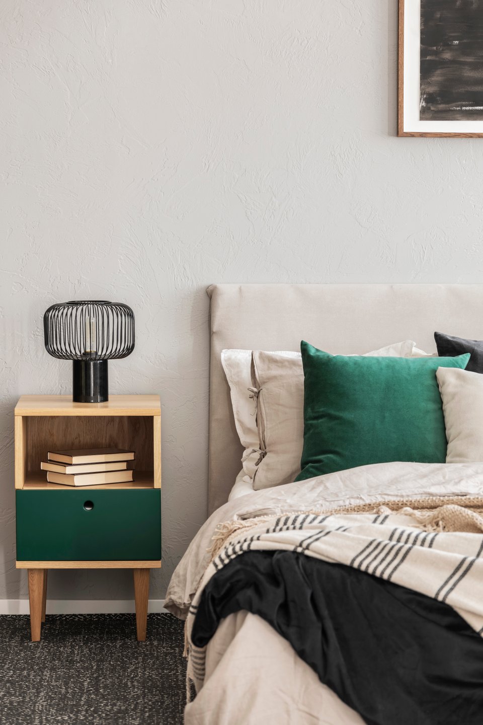 Вариант для тех, кто боится перегрузить комнату. Белый, серый и бежевый помогают смягчить насыщенность изумруда. Благодаря такому сочетанию пространство становится более спокойным и визуально легким.