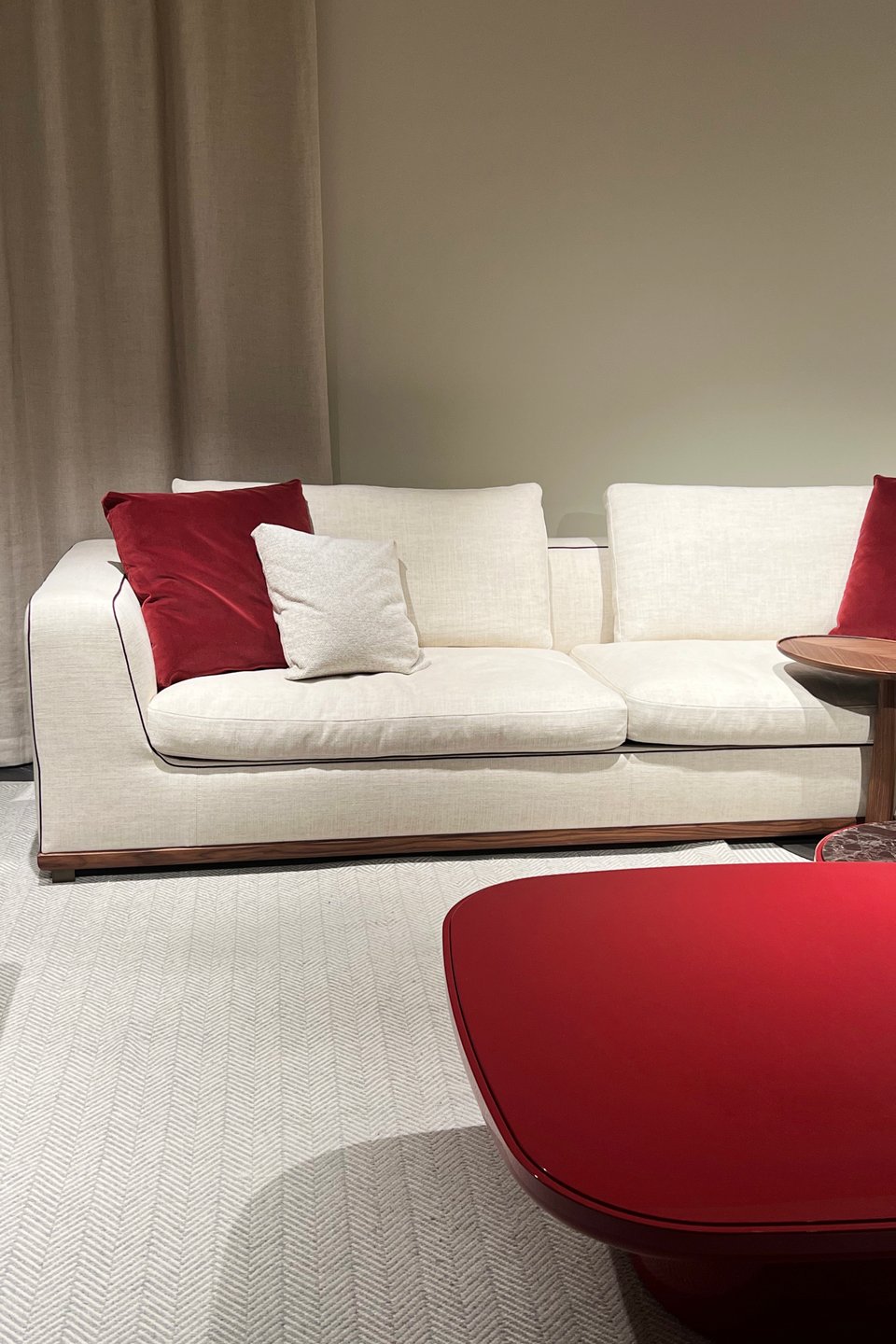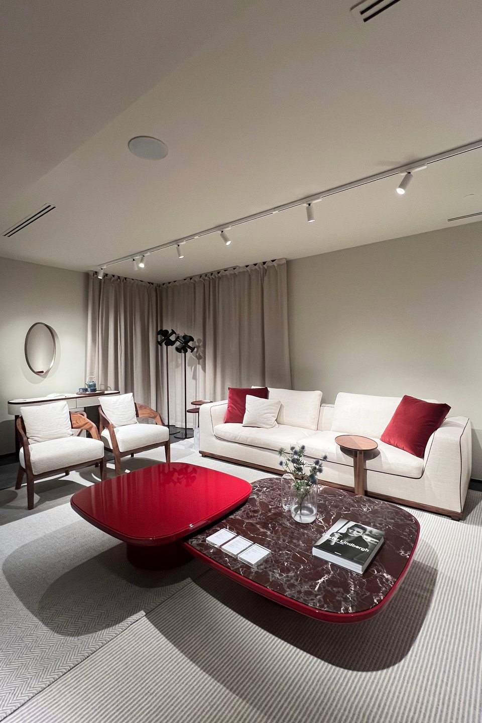 Красный — не базовый, а усиливающий элемент. Проявляется в деталях, текстиле, акцентных предметах. Добавляет композиции энергию, страсть и интеллектуальную смелость. Напоминает о силе таких символов, как Valentino Rosso, перенося кутюрную уверенность в интерьер. Работает как смысловая ссылка на историю дизайна и ремесел, оживляя более приглушенную палитру.