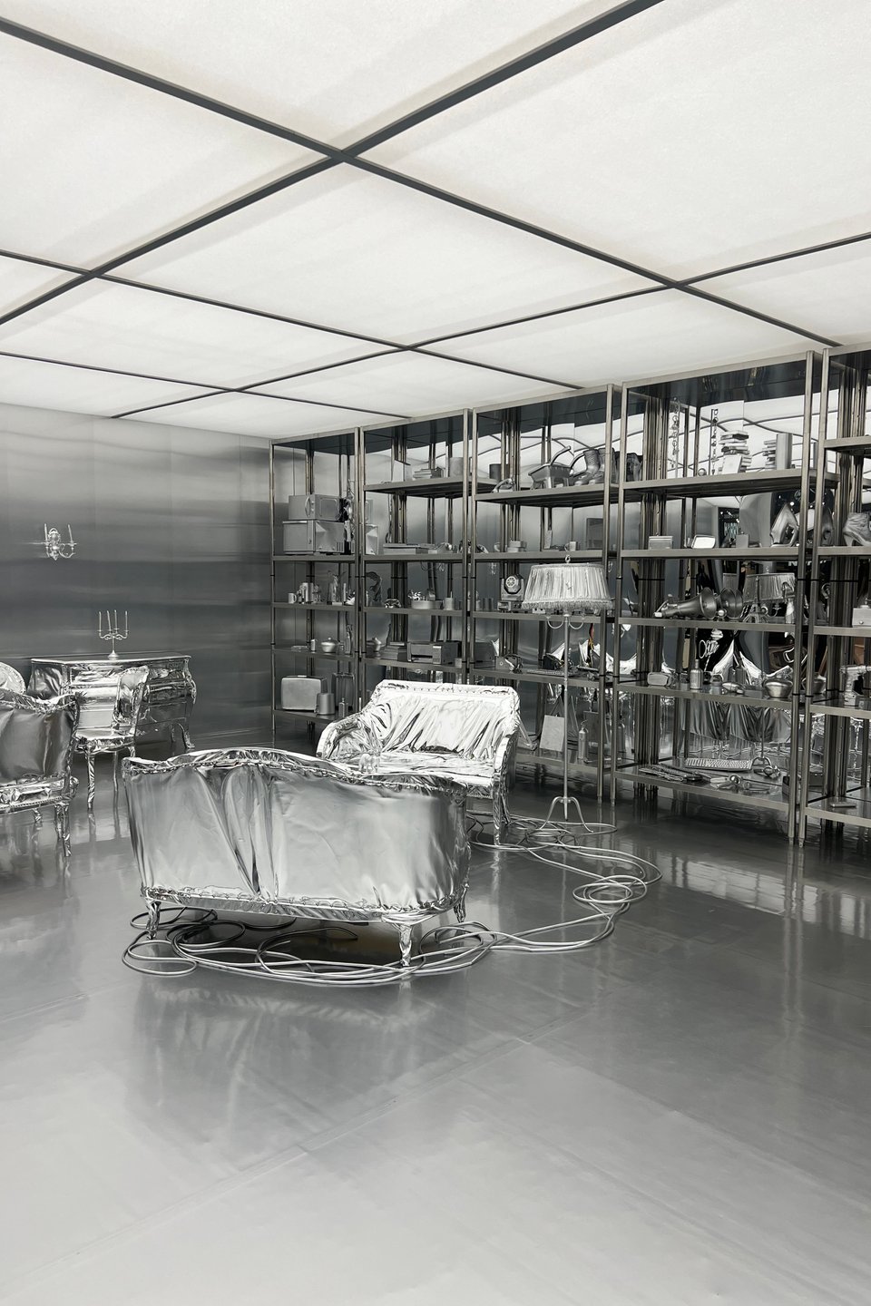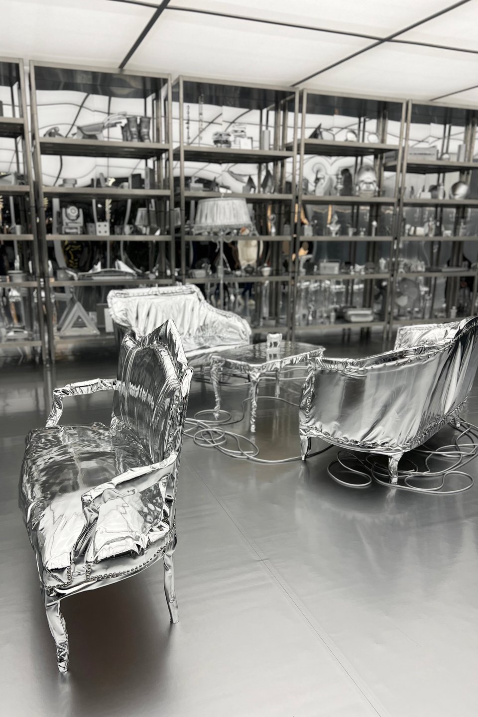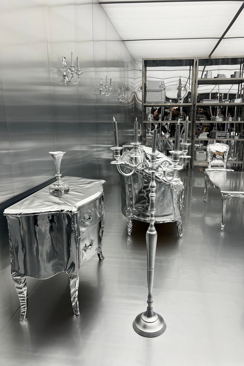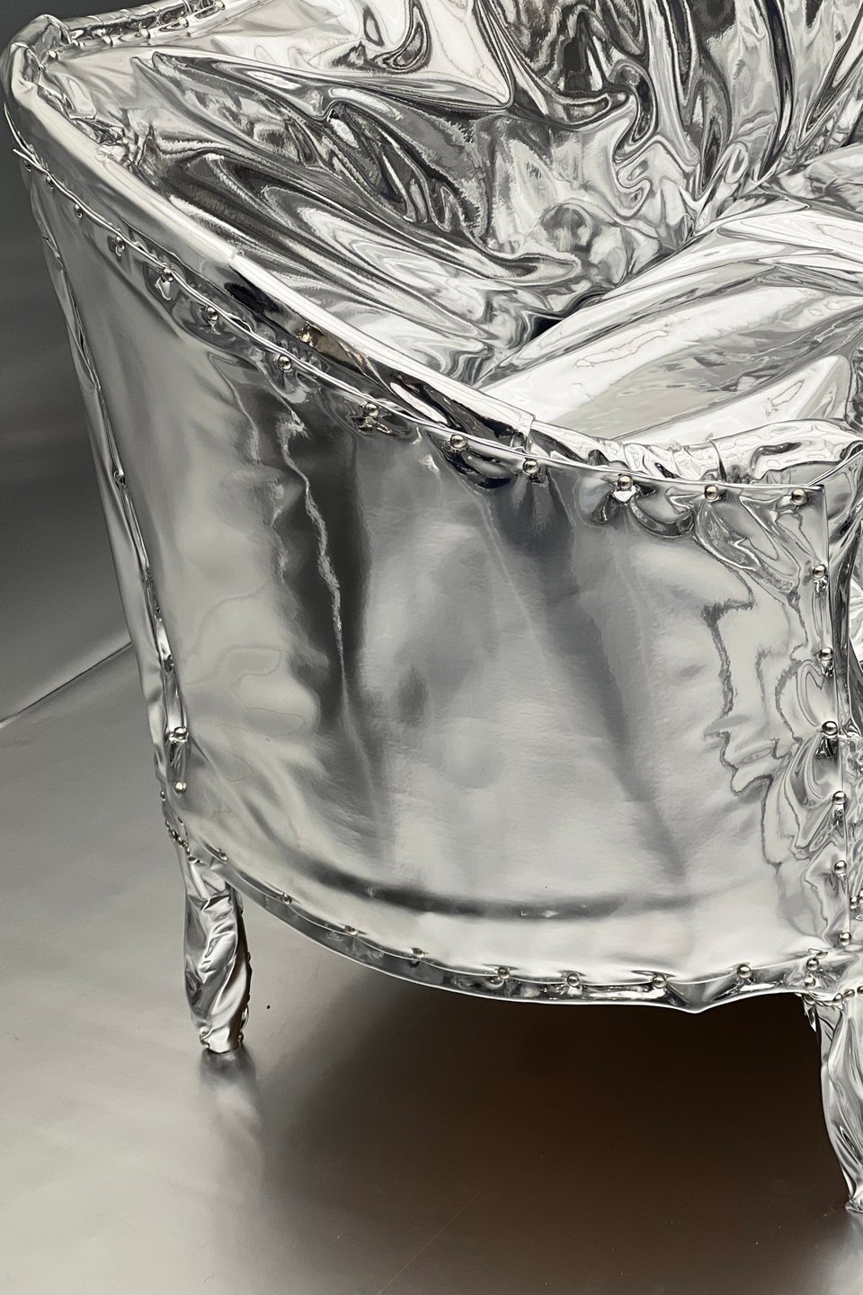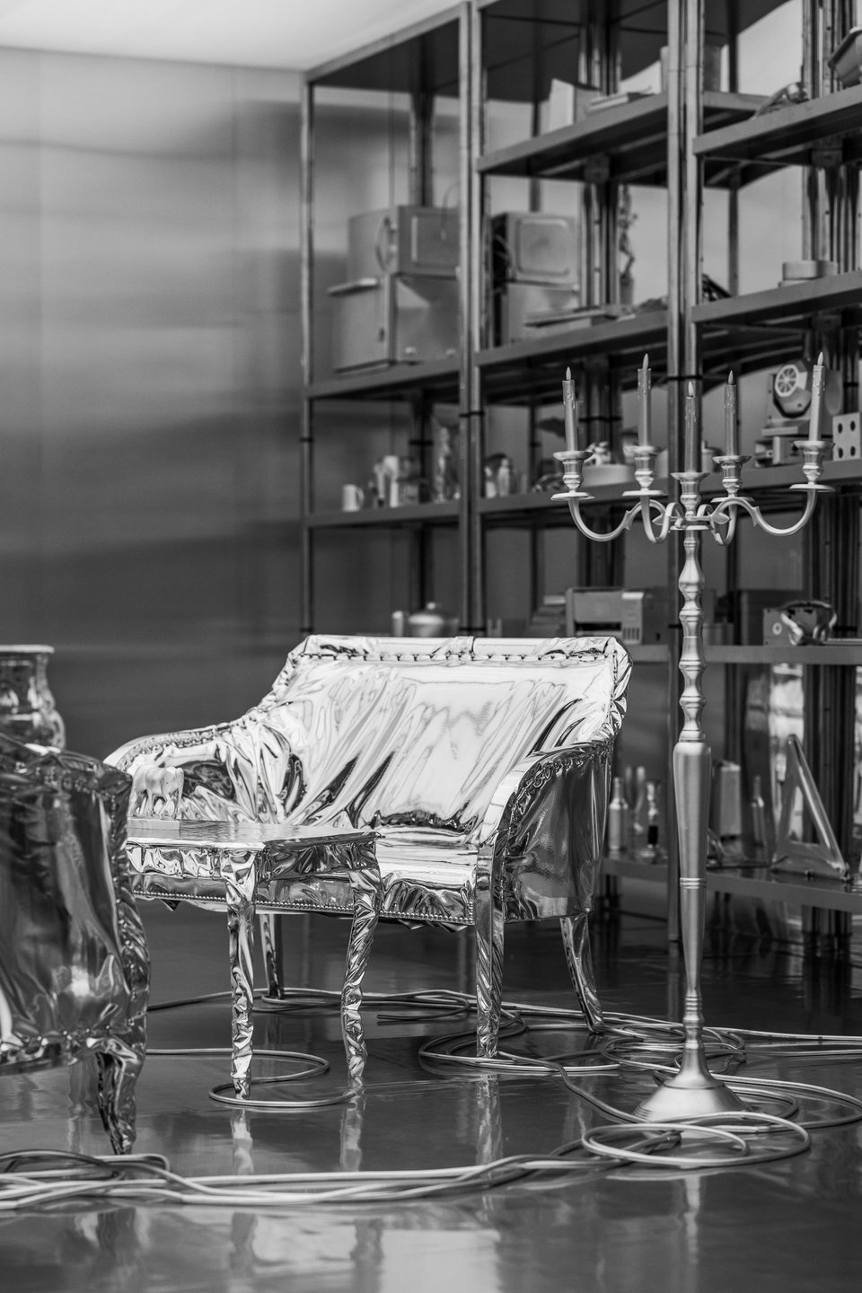 Известный художник Гарри Нуриев предлагает радикальную медитацию: он покрывает единой монохромной, чаще серебристой, поверхностью объекты разного калибра — от канонического дизайнерского стула до скромной детской игрушки. И стирая уникальность и «ауру» каждого предмета, создает новую, коллективную ауру целого: звенящую, холодную, гипнотическую.